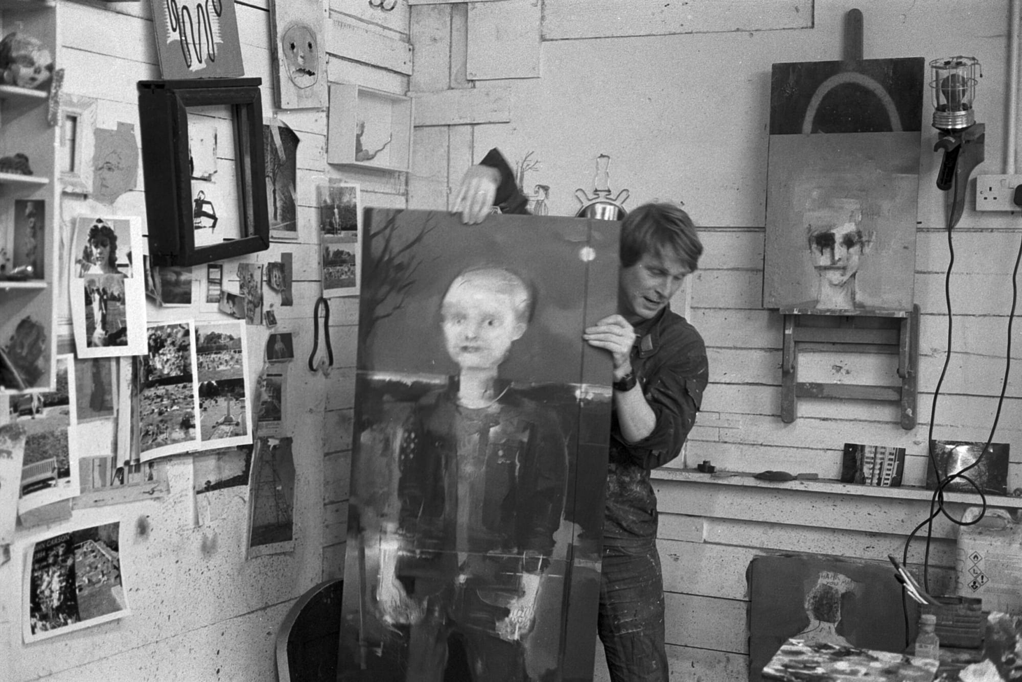 Looking closer at these portraits we can see they have stories to tell of themselves, a visual representation of the human condition. For example the photograph of Fred Cuming RA (1931-2022) taken in his studio in 1985. Our much admired and beloved narrative landscape painter is surrounded by all the material attributes that go with his profession, unfinished canvasses in various stages of completion, tubes of oil paints oozing onto palettes, alongside many used paint brushes which are strewn about. In the foreground the painter sits leaning forward and so there he is, in all probability the greatest colourist that this country has ever produced.