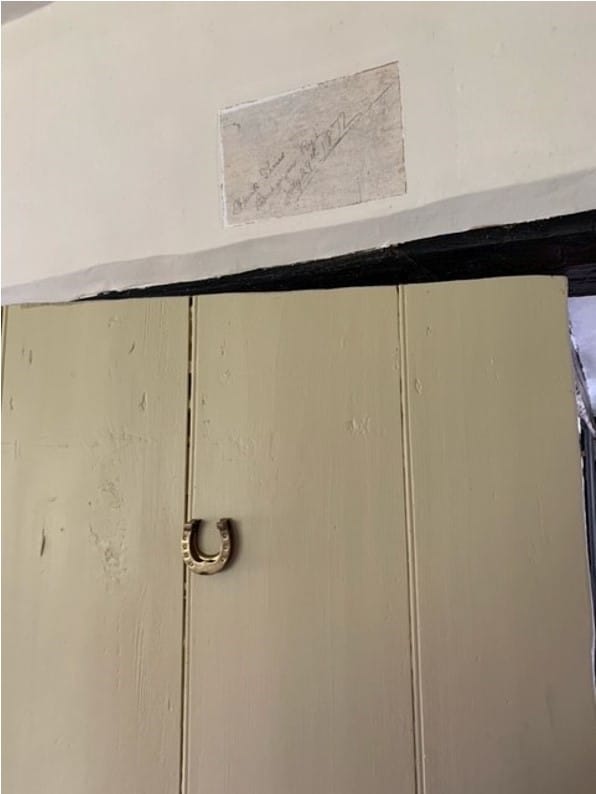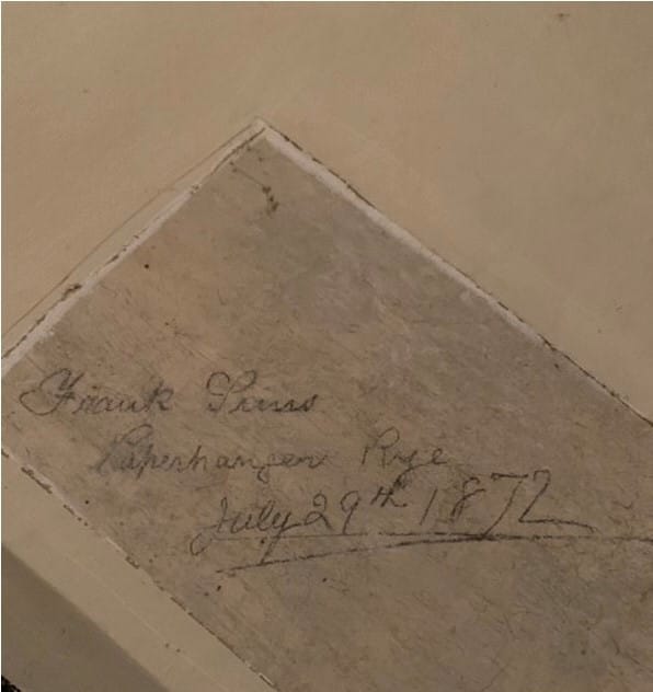 This story has another twist. A local resident and friend of mine also saw the article and the name Sims rang bells with him. He lives in a beautiful period farmhouse nearby and on one wall is an inscription which reads, “Frank Sims, Paperhanger, Rye July 29th, 1872” (see main photo below and in gallery). Over the years, the inscription has remained intact despite changes in décor by many generations of custodians whose decorators having reverently painted around it. It has been established that Frank Sims is a distant relative linked to both Trevor Monk and John Sims in America.