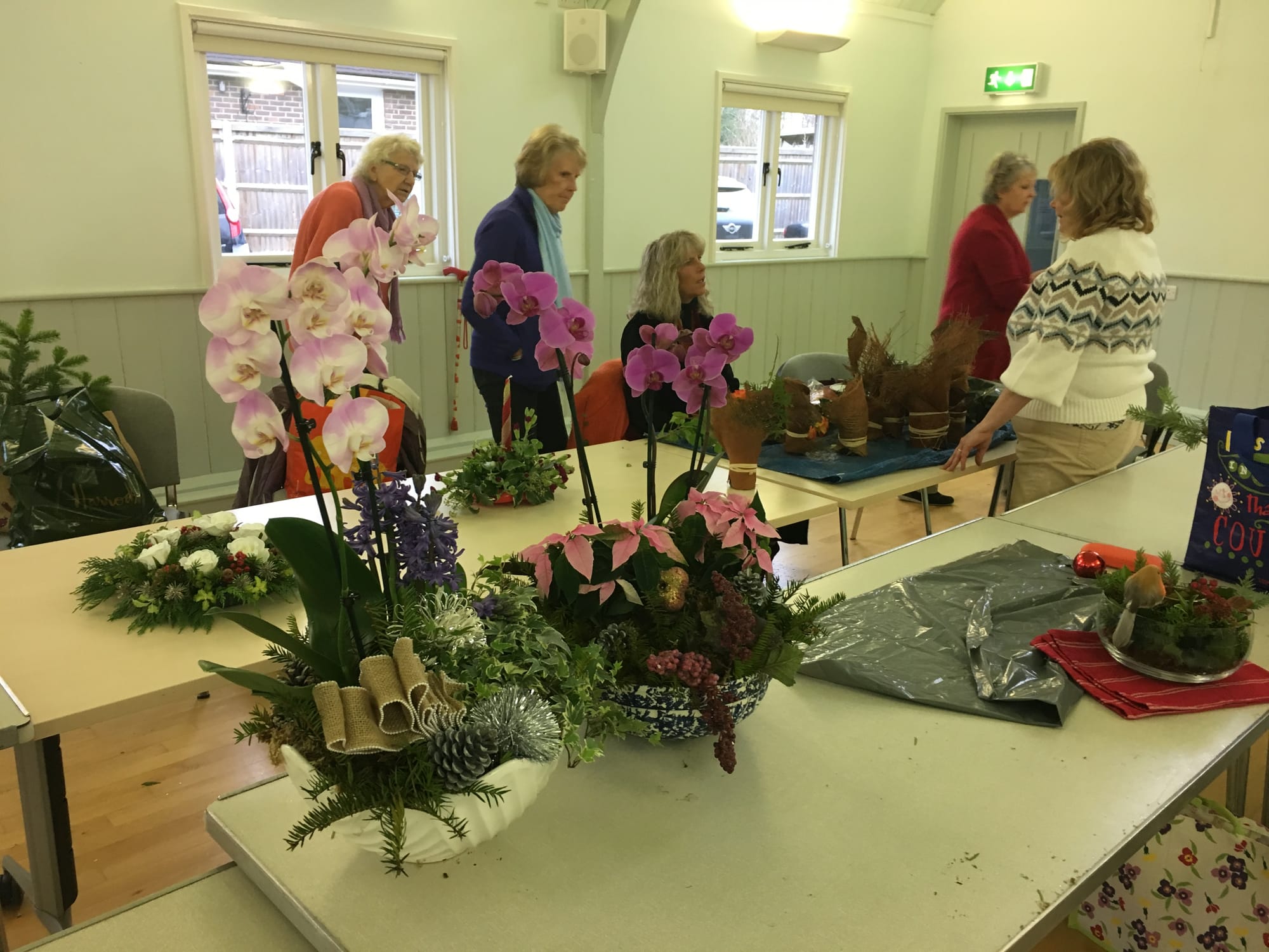 One person had brought two large bowls of orchids to finish with greenery silver ribbons and stars, a number crafted arrangements with candles and were planning to add fresh flowers nearer to Christmas. An array of jam jars and other receptacles were covered in hessian for decorations made to order for friends. A wide variety of arrangements gradually took shape, and (for once) everyone was pleased with the results.