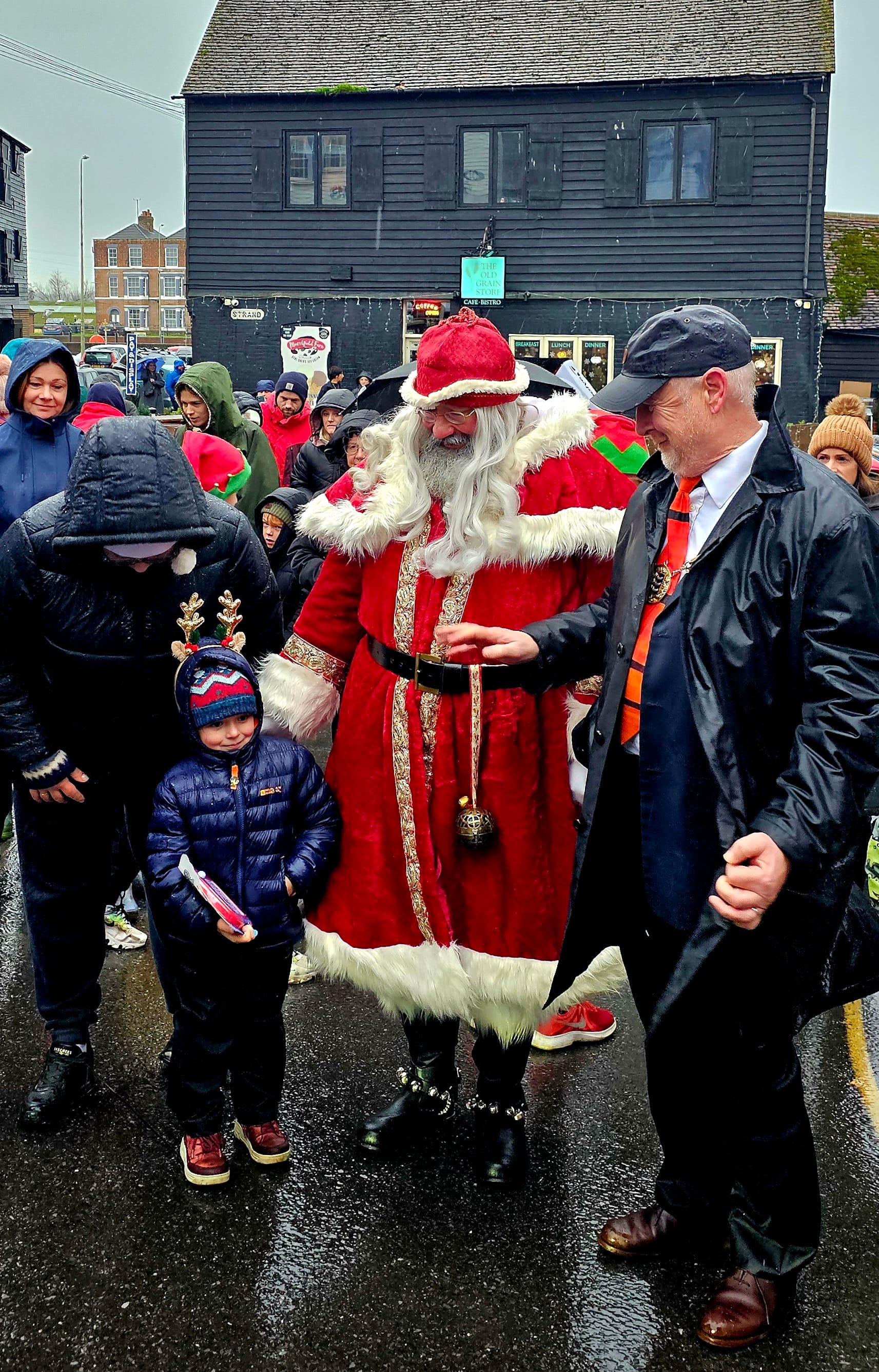 On two Saturdays leading up to the big day, Sophie makes sure that Rye is turned into a shopper's paradise, a venue for arts and craft displays, live music and a family fun day. This year, two unexpected and malign members were added to her team; Storm Bert, on Saturday November 23 and Storm Darragh, last Saturday December 7.But there is no storm greater than the joy on a child's face when they see Santa Clause. Down on Strand Quarter, with her customary warmth and hospitality, Sarah Warry-Mckie invited Father Christmas to make the Old Borough Arms his Rye headquarters once again. At 11.00am and followed by his elves, he descended the stairs into a sea of ecstatic children, dressed up and totally oblivious to the weather. He was received, as befits his status, by Mayor Andy Stuart and the Town Crier, Paul Goring, before making his way to his grotto at the Landgate.