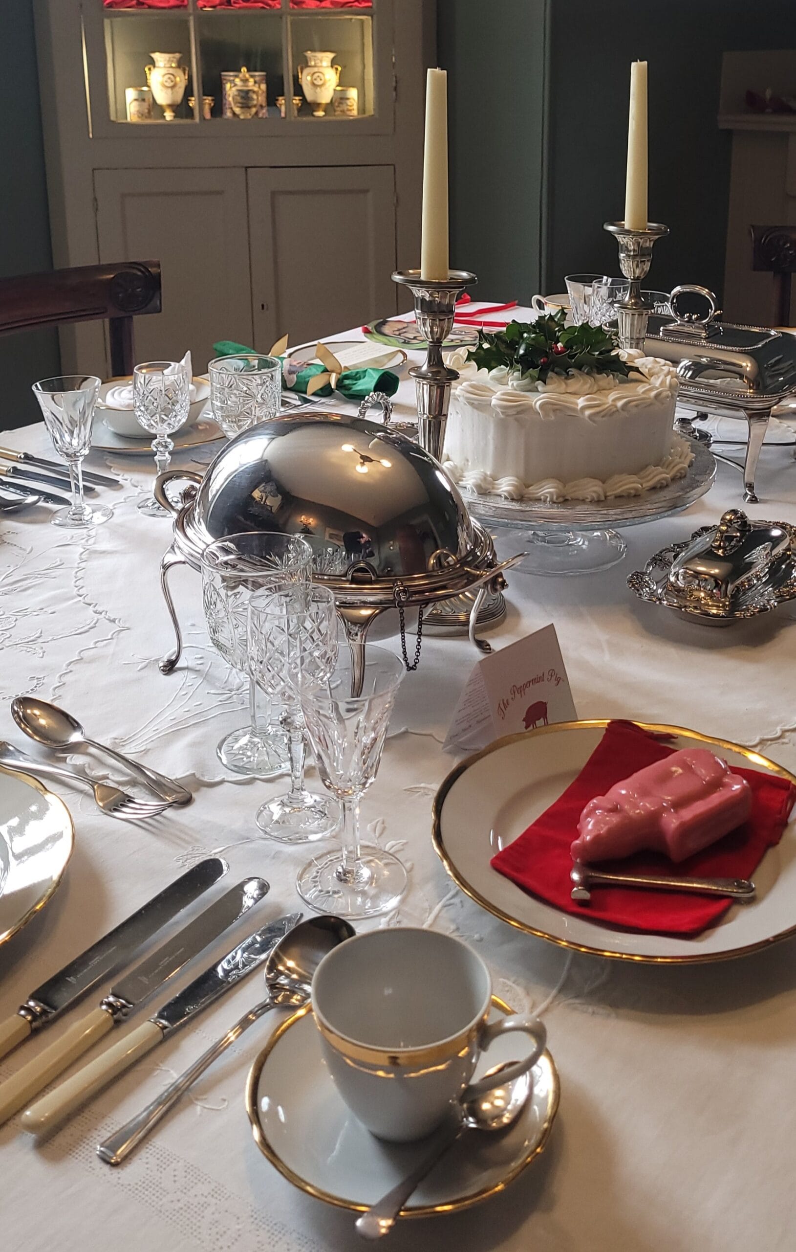 The dining room is ready for the Christmas meal, with the cake taking pride of place. On a plate, a pink pig made of peppermint, a little hammer alongside, has come all the way from Saratoga Springs, New York. The Jameses continue a Christmas tradition: the pig is put in a pouch and passed around the table. Each person has a turn hitting it with the hammer and sharing a happy memory from the year and, at the end of the meal, everyone has a piece of the shattered pig.