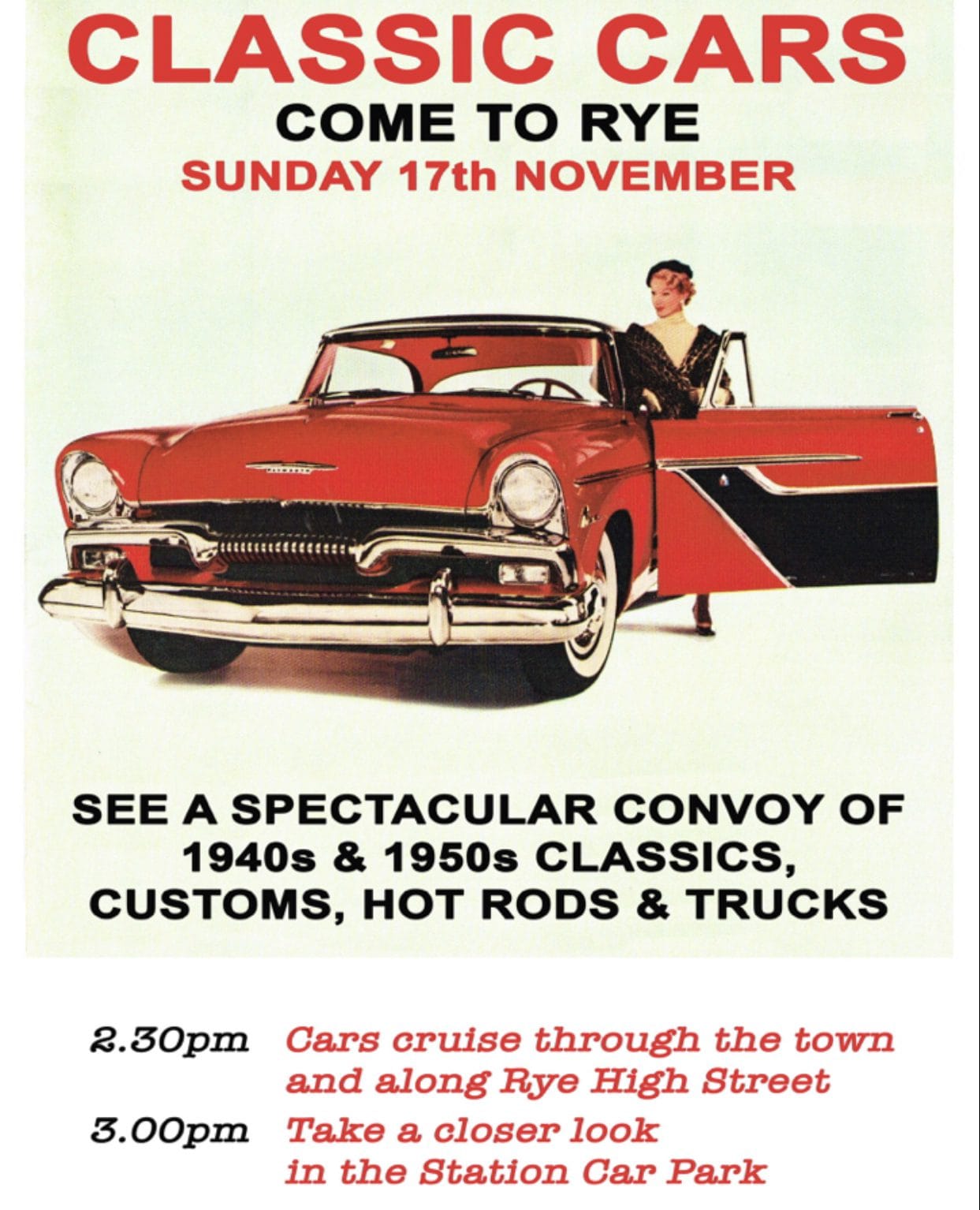 On Sunday, November 17, the annual classic car rally comes to Rye. Not just cars, but hot rods and trucks from the 1940s and 1950s will be cruising along the High Street that Sunday afternoon around 2:30pm. Then they will be lined up at 3pm for close inspection at the station car park.