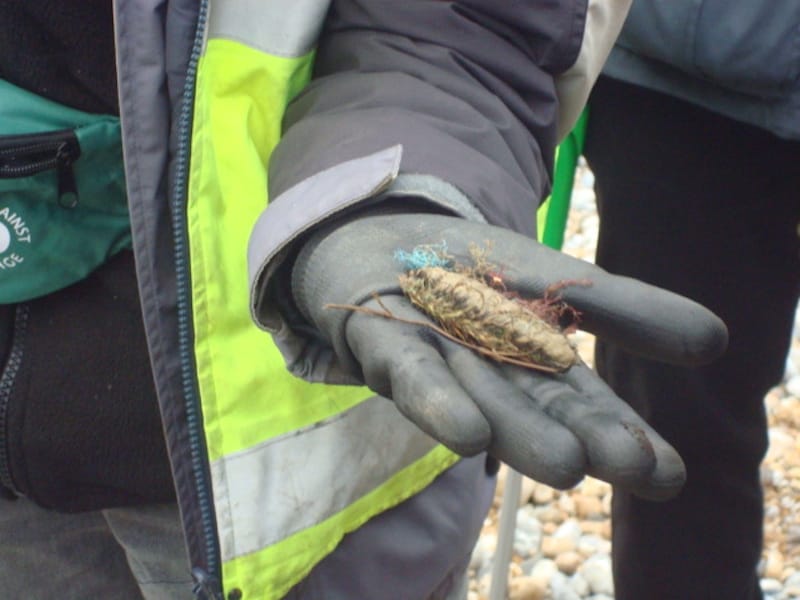 Apart from the usual suspects – fishing net, single-use plastic bottles, baby wipes – Strandliners’ volunteer citizen-scientists picked up some stranger items: a sea-mouse (pictured, right) with fishing line entangled on its prickly back; a WWII-era rifle bullet (the Lydd firing range has been in operation for over 150 years); a plastic ID tag from a Maine lobster-pot that washed across the Atlantic; and a slab of larvikite pearl granite stone identified by the geologist member of the Strandliners’ team. This last, bumping along the sea-bed, had travelled from the man-made sea-defences at Fairlight Cove to the Galloways shoreline, a marine journey of 20 miles and, possibly, 20 years.