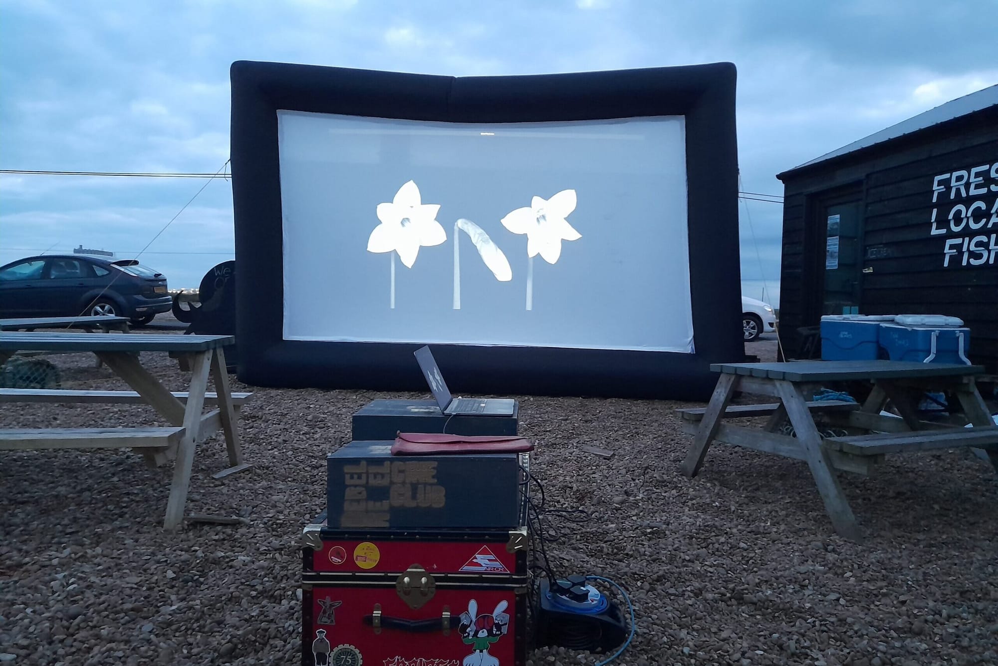 For anyone not aware of the occasional summer open air cinema behind the fish shack in Dungeness, they are truly missing something. The singers of the Marsh Choir were told by their leader Carly Bryant about the screening of Great Expectations, as advertised on Instagram. By arriving early one could bag a space, there were benches and tables dotted around at the back of the shack, used by customers when the Snack Shack is open and selling fresh fish.