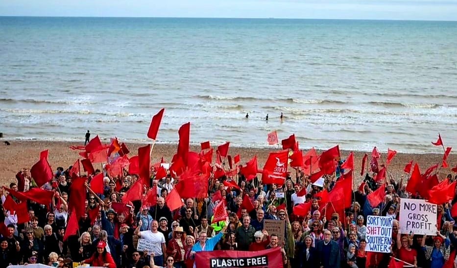 Members of Clean Water Action carrying red flags and placards declared "Enough is enough" as a huge turnout of supporters gathered at Azur Beach in St. Leonards. The protest followed several recent sewage releases along the south coast that led to beaches at Bexhill and Normans Bay being closed off. People were also warned not to swim in the water at Seaford in case of sewage washing up on the beach following heavy rain.