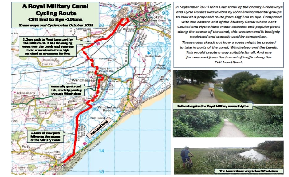 Sussex Greenways are working on a proposed Royal Military Canal cycle route from Cliff End, Pett Level to Rye via Winchelsea, improving existing paths and making new connections, a safer route avoiding Pett Level Road which has no cycle possibilities except to ride on the road, which is dangerous.