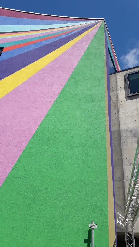 The Towner Gallery in Eastbourne has commissioned a temporary art work which has transformed the exterior walls of the gallery into a large-scale colourful, geometric mural called Dance Diagonal. It will be on view till May 31, 2020.