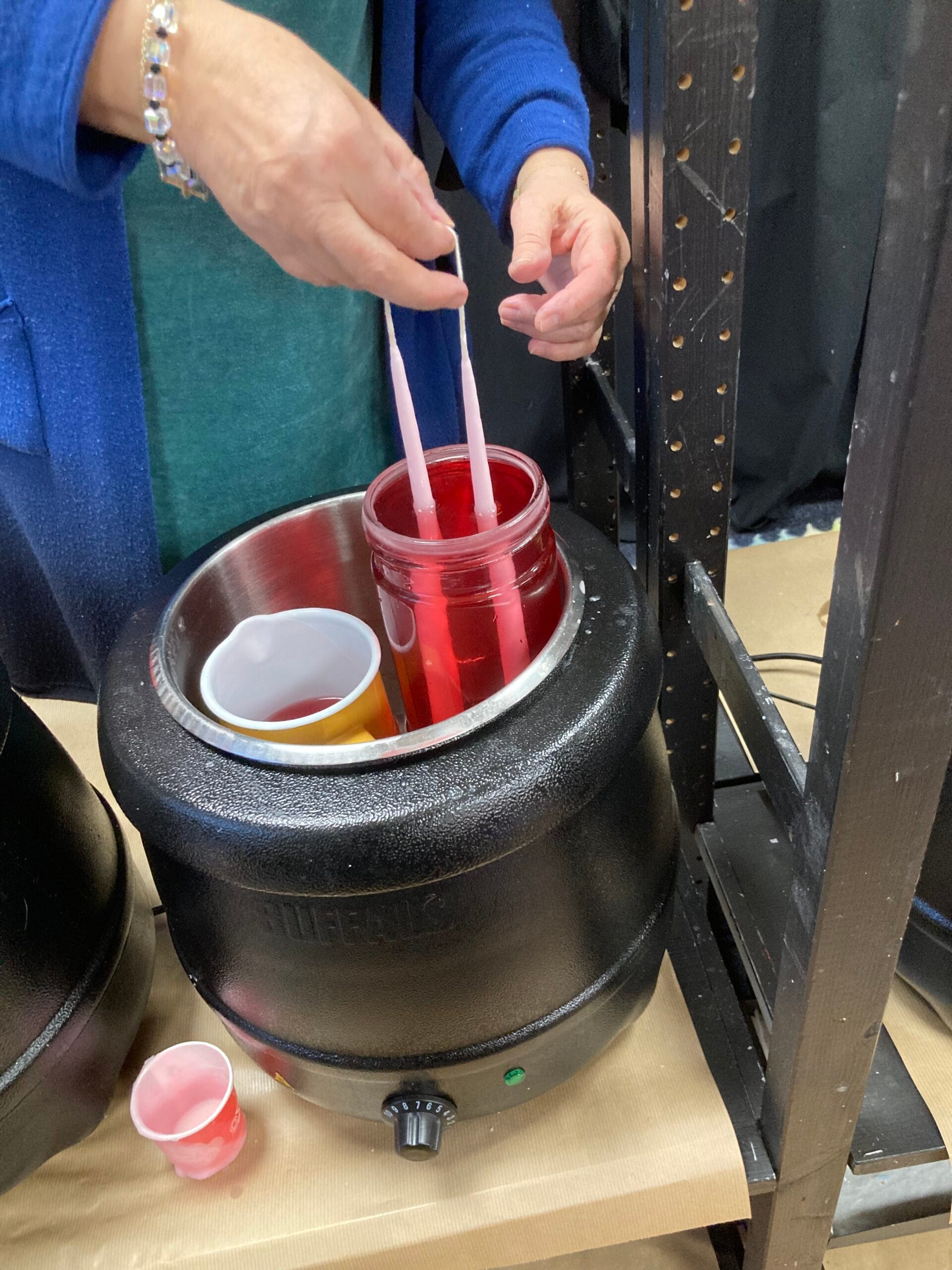 We had no idea what to expect, but it was all very good fun and very productive. We made three pairs of quality candles in the colour of our choosing. We started off being placed in front of a little electric burner which was keeping our molten wax at a steady 65/70 degrees Fahrenheit.