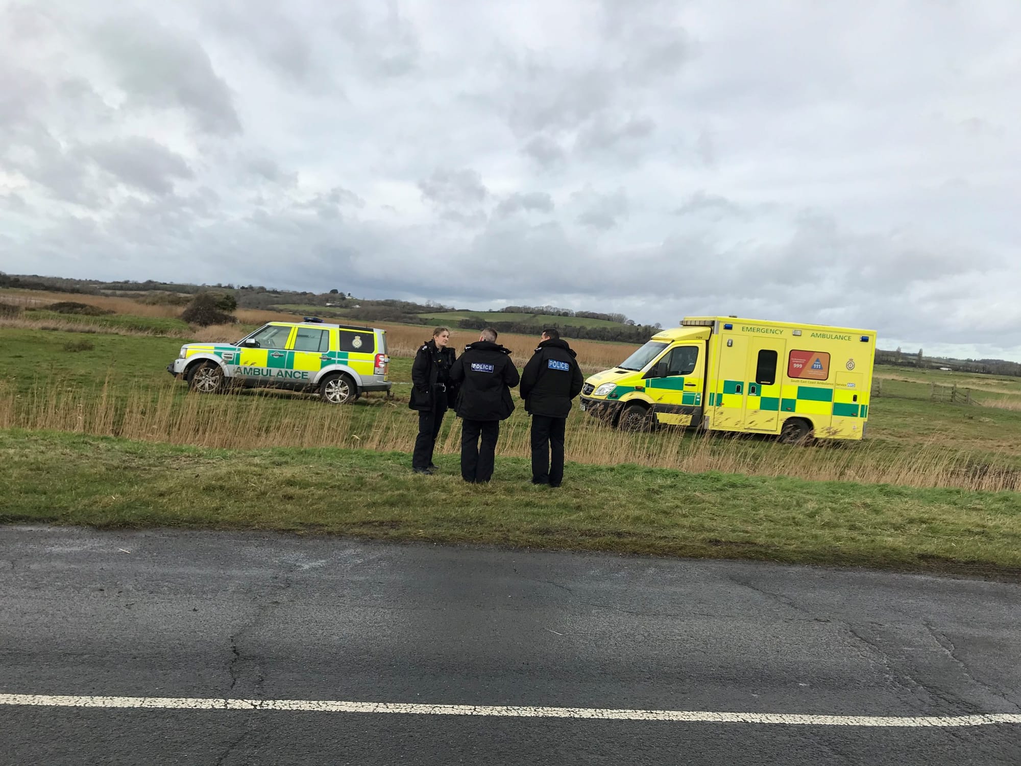 The patient was on the other side of the ditch and the ambulance had little choice but to drive along the sodden field to get to him in time, as he had started to get cold and was phasing in and out of consciousness. The medics and ambulance crew then took over proceedings, the patient became stabilised and then two police cars arrived at the scene and an officer took statements after Larry Cooke had very calmly explained to them what had happened.