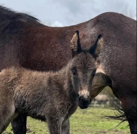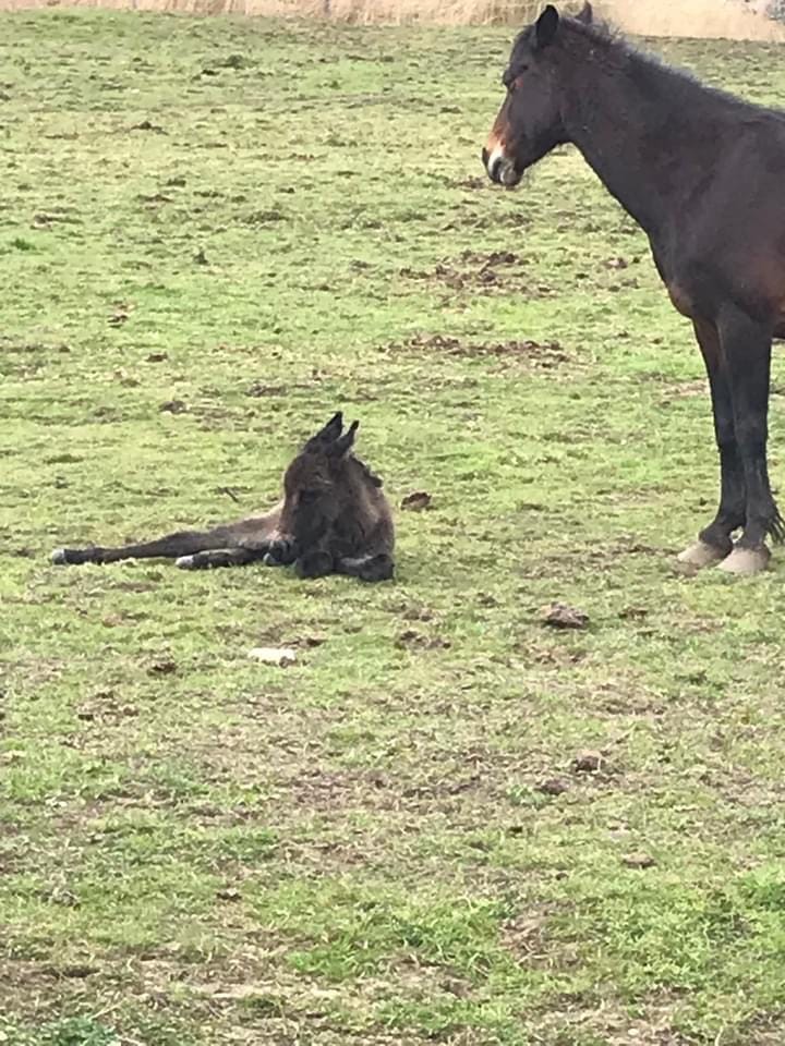Sharon didn't know the exact date of the arrival, and as we know these things happen in their own time. In the early hours of April 8, Kitty had her foal in the field. Kitty knew what to do alone and unassisted. Her instincts took over and she was absolutely fine. The mule colt is perfectly well and healthy and began feeding from his mother within a short while.