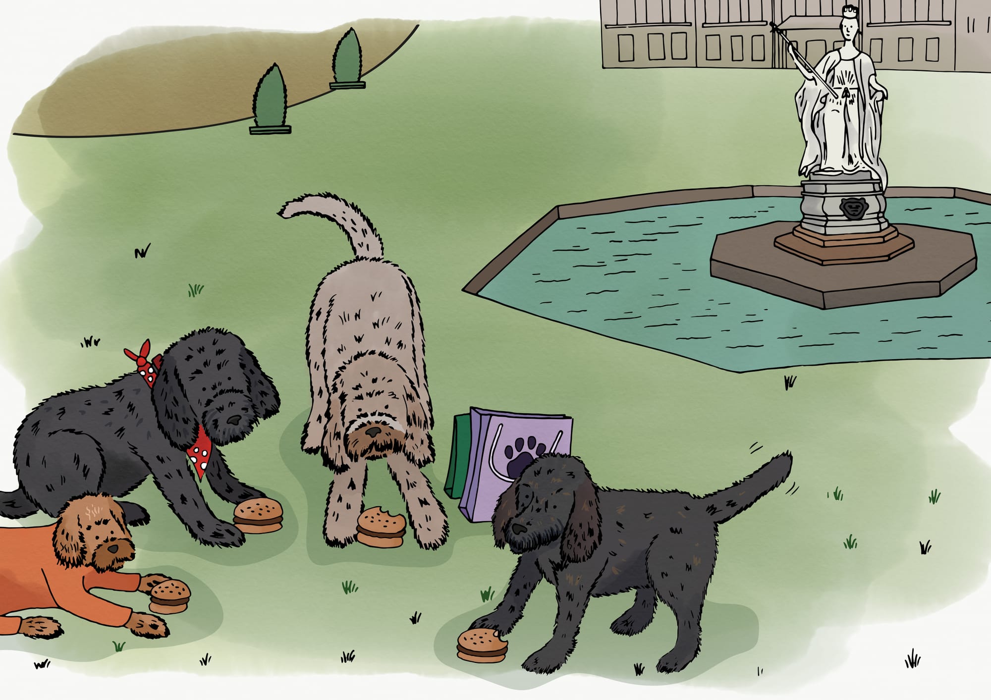 BooBoo introduced Dante and Phoebe to Giles before he bent down to give them all a juicy piece of lean beef. It didn’t take Dante more than two chomps to finish his before looking up and begging for just that little bit more. At that moment a furless two legs walked in to order a joint of lamb for their Sunday lunch, so the doodles left and walked on though the market.