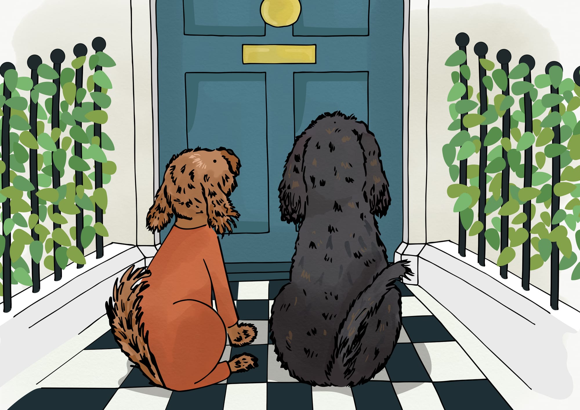 Dante knew that BooBoo lived at number 33, but as they couldn’t see the numbers high up on the doors, they decided they would put their noses to the pavement and follow BooBoo’s faint smell. After a while the scent became stronger and they knew they were going the right way. All of a sudden Dante could smell they were right outside BooBoo’s front door. They walked up the step and sat down looking at the front door. Then after a big breath they both gave out two loud “HELLO” sharp barks.