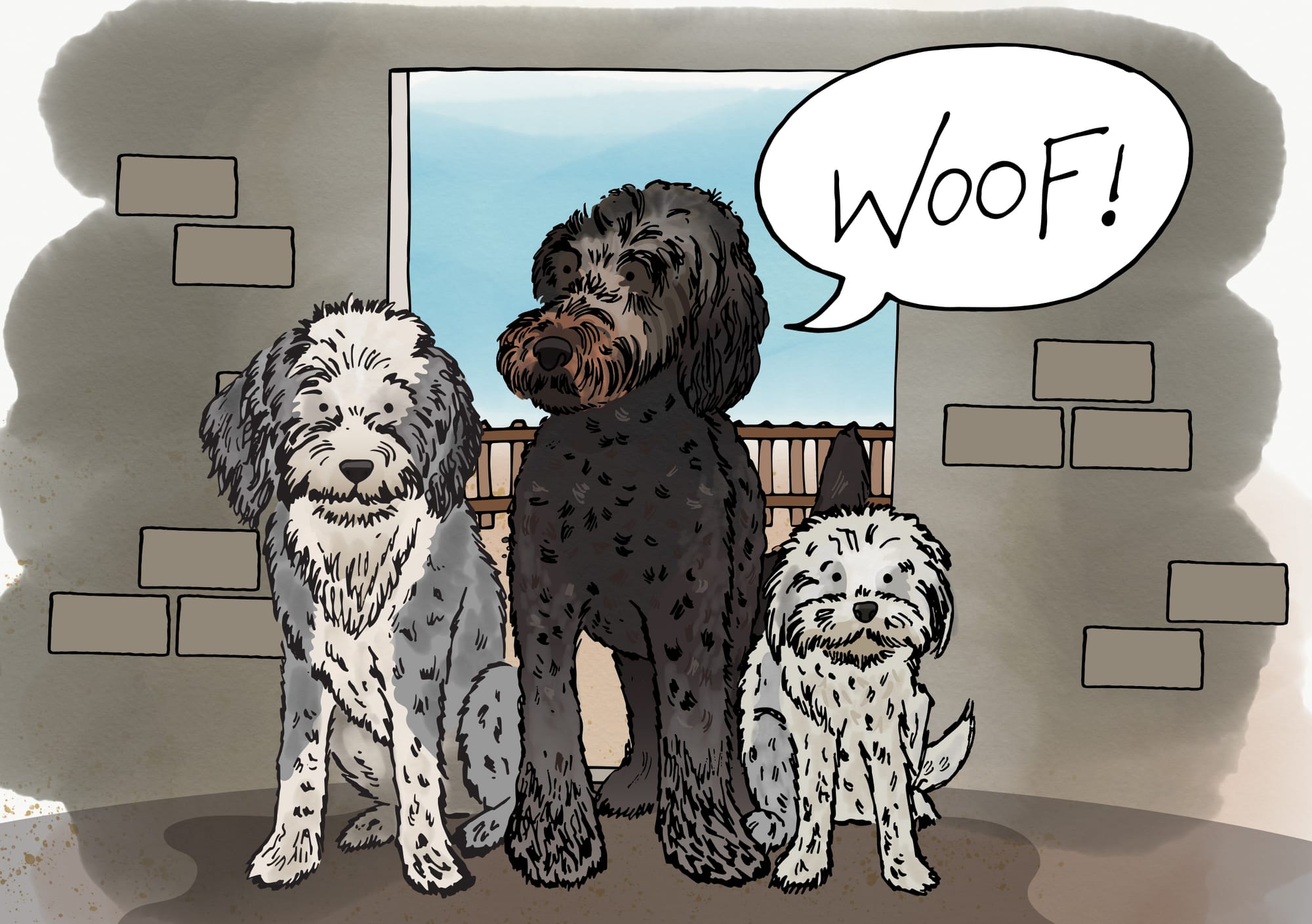 Truffles is a very tall doodle with lots of black, grey and white fur all mixed up together. He always has a smiley face and for every one step he takes Dante and Phoebe have to take at least two. Woolfie is completely black and just as tall as Truffles. Although he’s also a fast runner he sometimes prefers to lollop around in big circles following the end of his tail. Bo Doodley is a mini version of Truffles and she also has lots of black, grey and white fur all mixed up together. When she stands up tall and points her nose to the sky she can just about lick the end of Truffle’s ear.