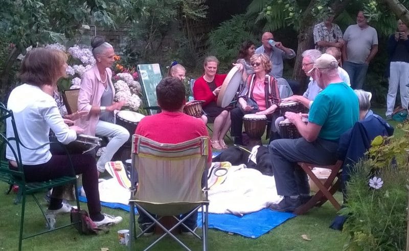 Liz Butt appeared with a selection of drums of varying types and sizes which she laid out on the lawn and around them was placed a circle of chairs. She then invited members of the audience to come and choose a drum and she led them in two sessions of drumming.