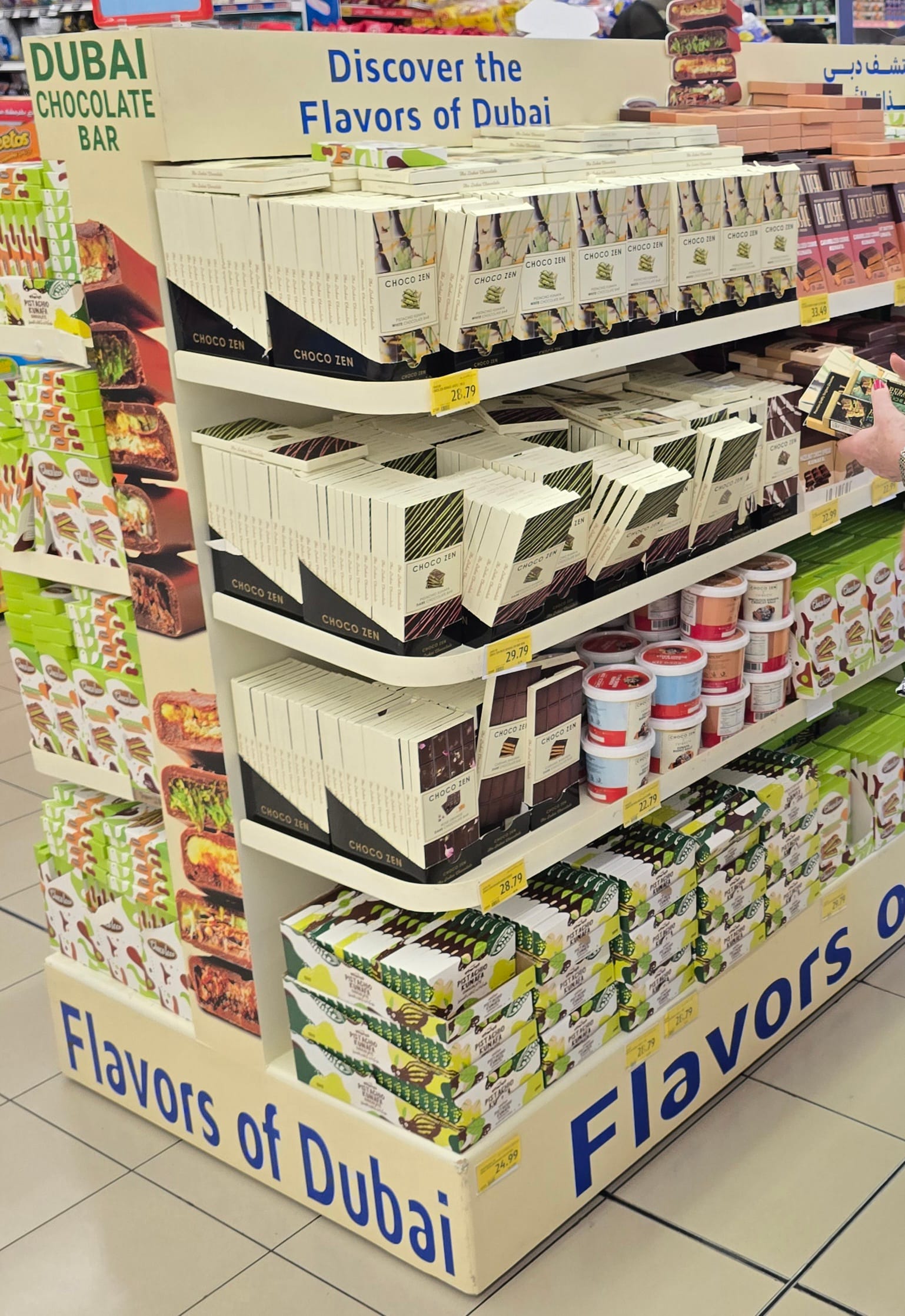 Has it reached Rye? Recently the Knoops shop has been offering "Dubai" drinking chocolate that features pistachio with a topping of Knafeh. In Tenterden, Waitrose have a display of bars made by Lindt. Most other supermarkets – including Tesco, Aldi, Asda, Morrisons - advertise bars but not all have it in stock! Prices vary considerably but for a quality bar expect to pay around £10 or equivalent.