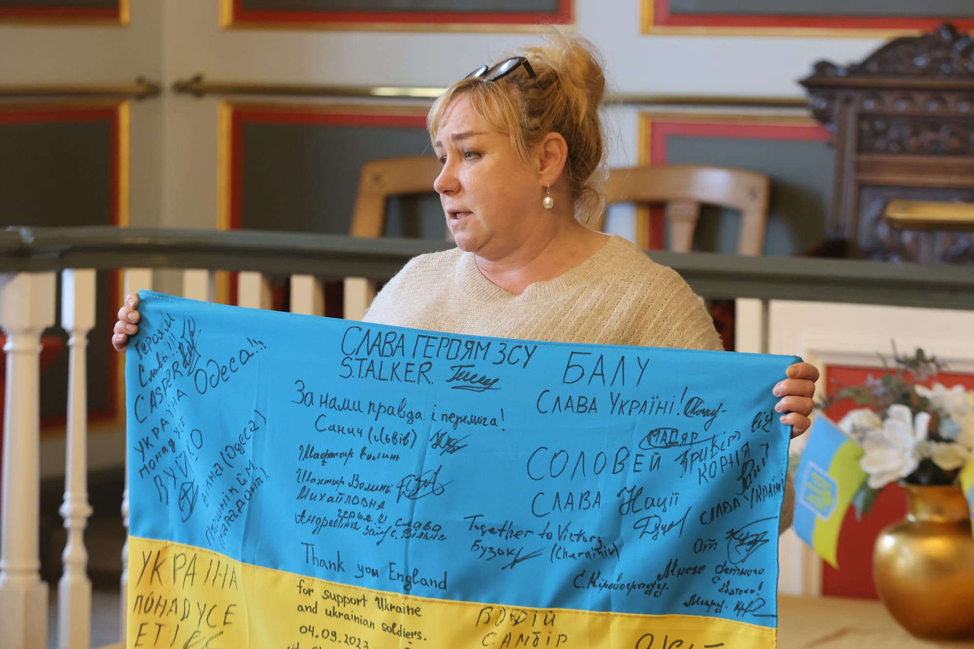 Whilst speaking she held up a Ukrainian flag signed by friends of her son who is fighting in Ukraine. She explained how many of the men who had written on the flag were dead. "I hope one day we will meet and celebrate an end to this bloody war."