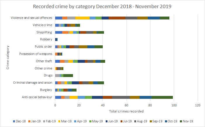 Like drug offences, crime relating to violence and sexual offences also made up over 10% of reported crime in November 2019. Crime within that category includes "offences against the person such as common assaults, grievous bodily harm (GBH) and sexual offences" but unlike drug crime, violent and sexual offences have been reported in every month in 2019, though the number reported fluctuates month-on-month. For the 12 months from December 2018 this category of crime is second only to anti-social behaviour.