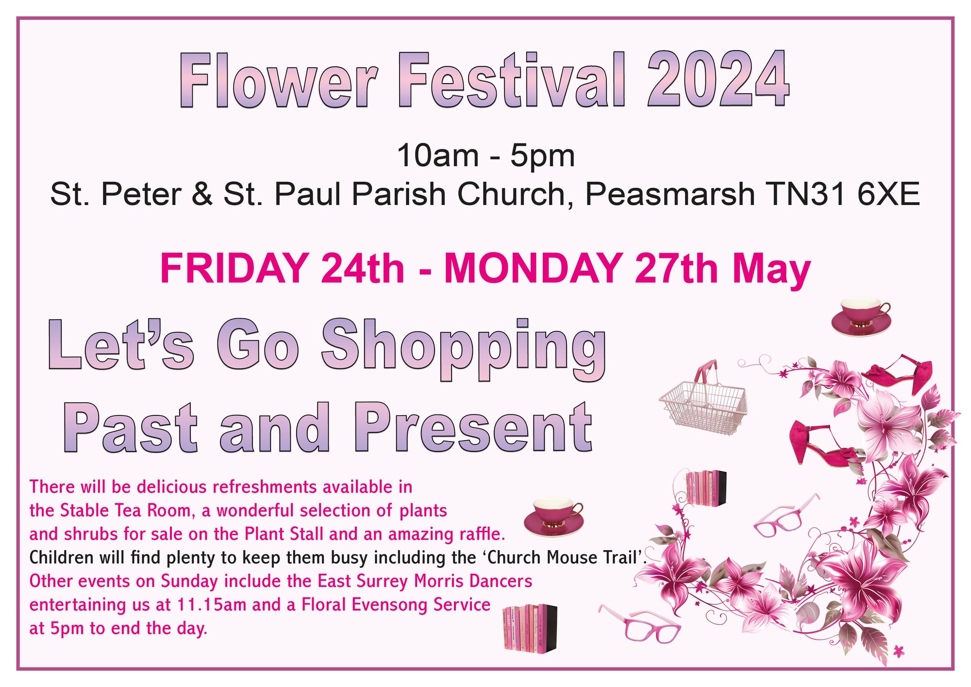 This Friday and through the bank holiday weekend (including Monday) is the annual Peasmarsh Flower Festival. For those who have been before you will know what a spectacle of colour awaits, made possible by a growing number of supporters who work so hard to make this event such a success. This year's theme for the floral displays is Let's go shopping, past and present.