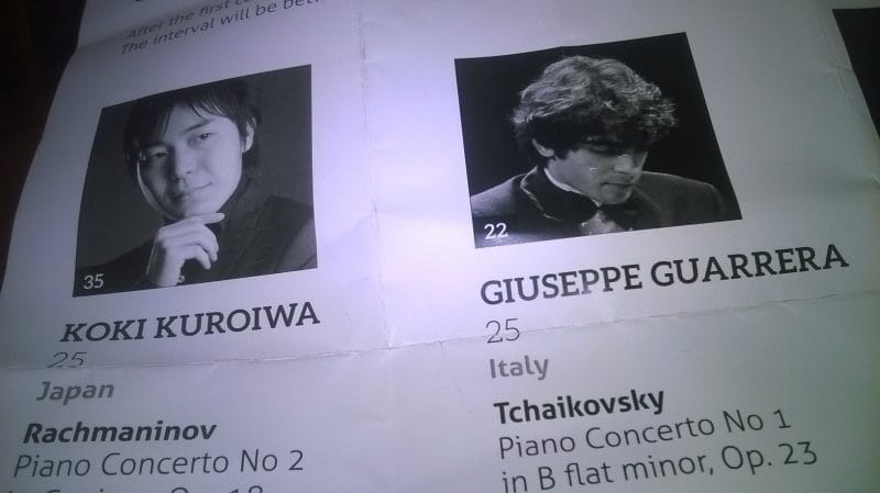 The pieces we heard were Rachmaninov, piano concerto No. 2, Tchaikovsky piano concerto No. 1 and Beethoven piano concerto No. 5. All three pianists were fantastic but my friends and I thought Giusppe Guarrera from Italy was the best, but of course we had not listened to the first three the night before.