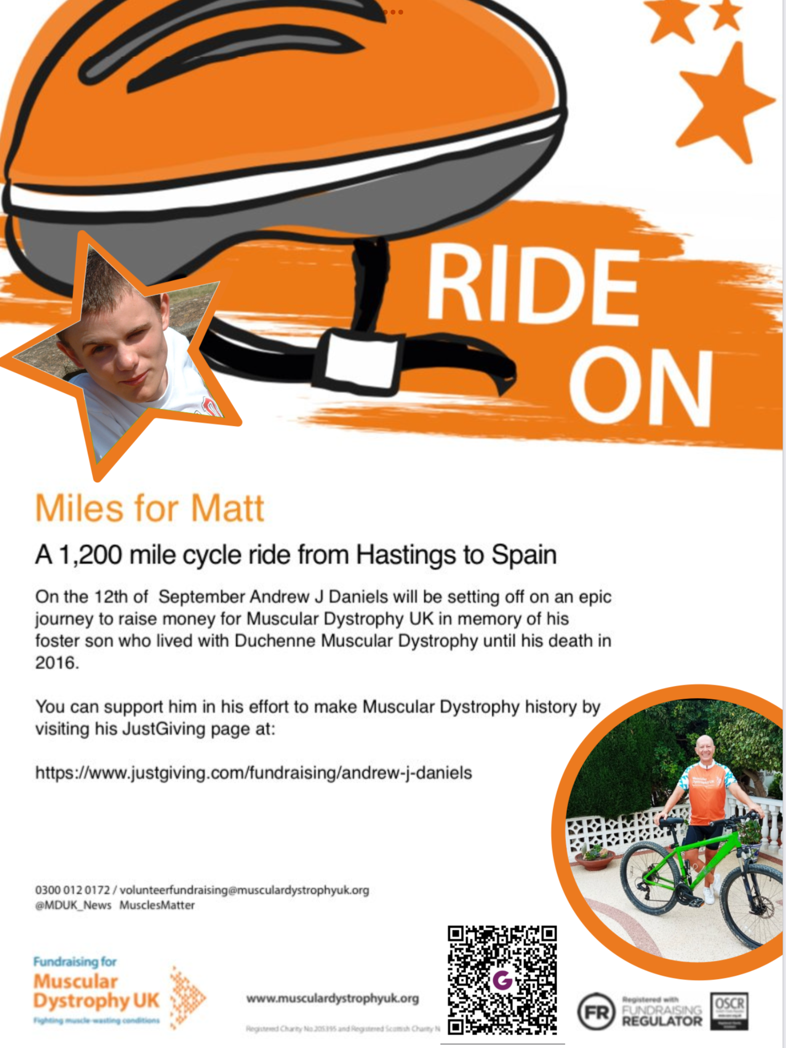 In 2002 Andrew fostered Matt, a twelve year old boy with Duchenne muscular dystrophy, a muscle wasting condition for which there is currently no cure. What followed were fourteen years of incredible joy and crushing pain until Matt’s death in 2016 aged 26. Says Andrew: "Knowing Matt changed my life and brought out the best in me. Every morning he woke with an excitement about the coming day that I will be channelling during my cycle ride. For somebody with muscular dystrophy each day requires huge courage and determination, so that will inspire me when the going gets tough."
