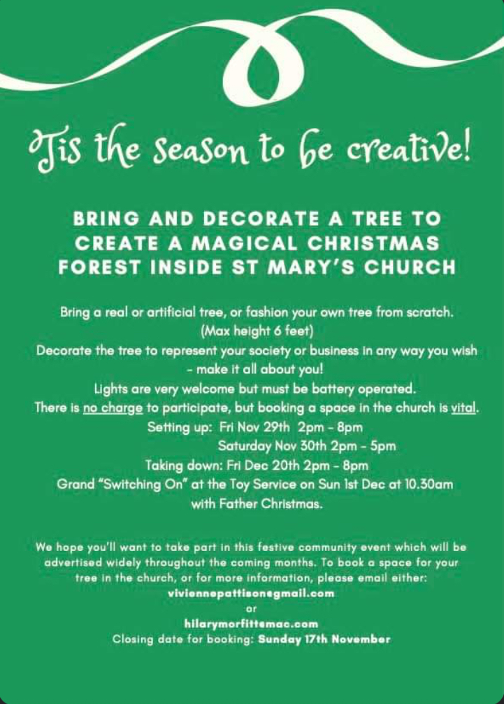 We hope you'll want to take part in this festive community event which will be advertised widely throughout the coming months. To book a space for your tree in the church, or for more information, please email either: