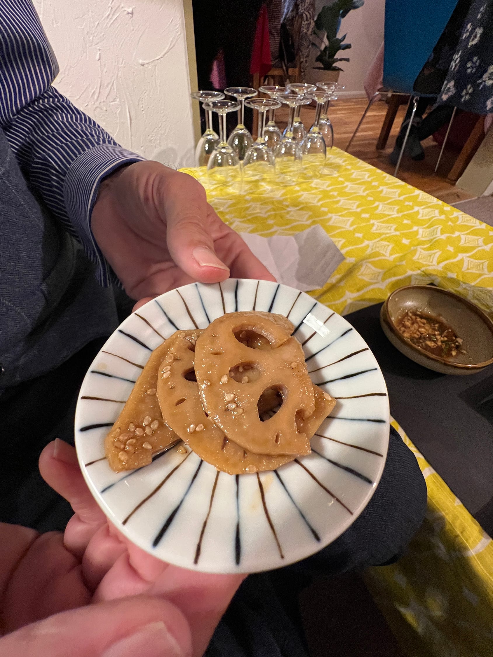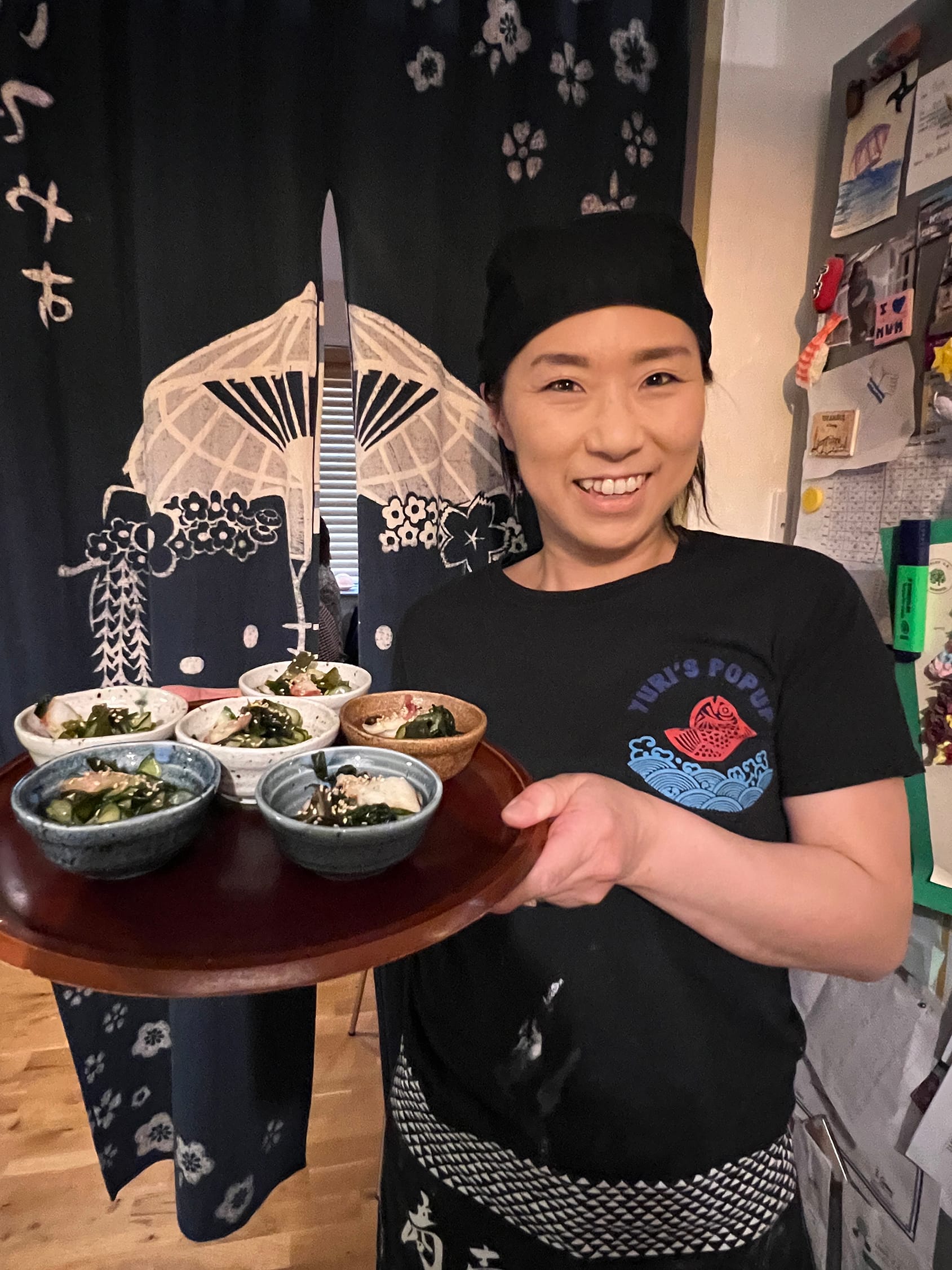 Having interviewed Yuri last week about her style of restaurant and cuisine, my husband Martin and I went to experience Yuri’s pop-up restaurant in person on Saturday, May 21. Shoes off at the door and then a warm welcome from Yuri and Andrew who were busy preparing the delicious delicacies that were to be served almost endlessly throughout the evening.