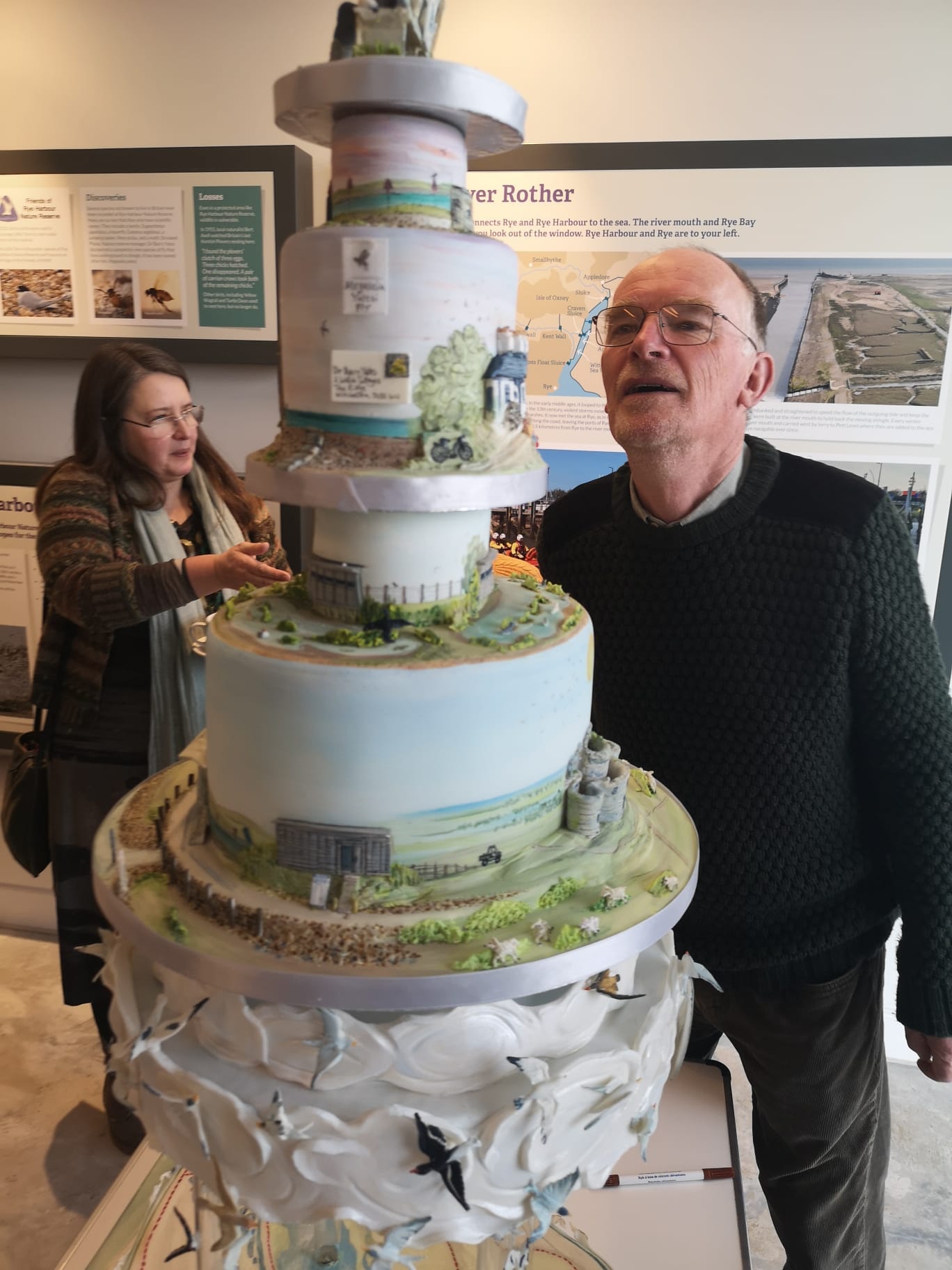 Cliff Dean summed up the event: “The centrepiece of our farewell tea for Barry, who is retiring as reserve manager after nearly 40 years, was an astounding cake created by local cake-artist-to-the-stars Rachel Mount. Standing about 1 metre tall, the cake’s three tiers were a compendium of the wildlife and landmarks of Rye Harbour, from a base representing the triangular map of the reserve (including seals and shingle trucks) up to clouds and sugar-sculpted birds then typical flowers and iconic buildings to the sculpted figures of Barry and Anne gazing out from one of our comfortable benches. For those studying at close quarters, inhaling sweet sugary scents, there were dozens of tiny details including banners listing Barry’s many achievements and miniature copies of our successful books. His muddy bicycle could also be found.