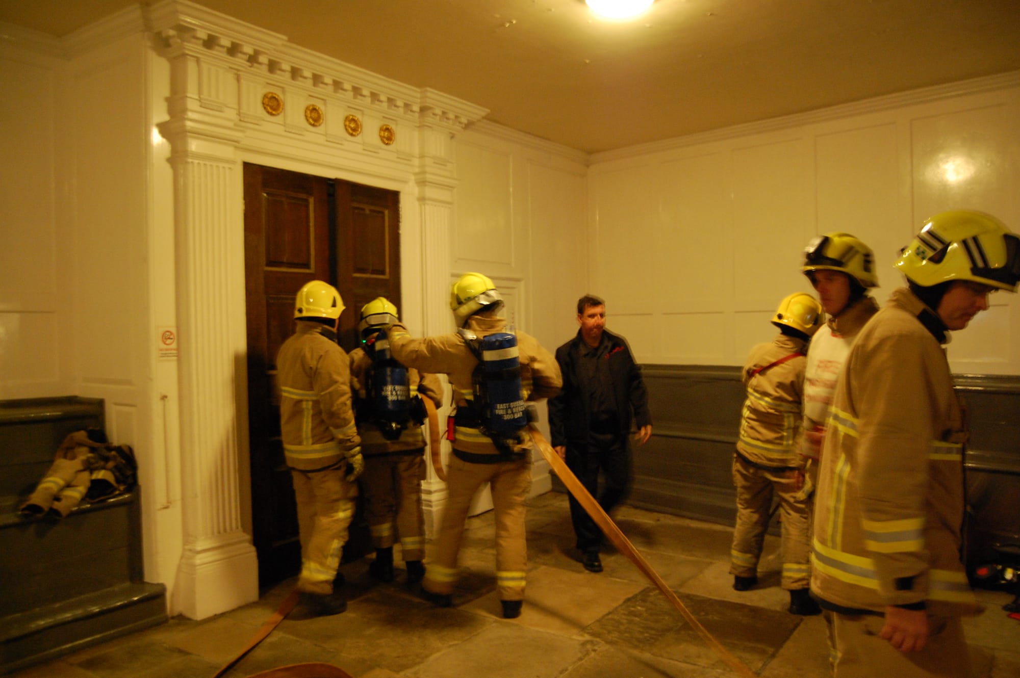 Two fire appliances were seen reversing up Lion Street towards the Town Hall on Tuesday evening, November 14. Two fire crews from the Ferry Road fire station assisted by a further crew from Battle had come to practise with their brand new breathing apparatus. This equipment has recently been acquired by East Sussex Fire Service at a cost of £1,000,000 to be installed in each of 33 fire appliances across East Sussex, including the separate unitary authority of Brighton & Hove.