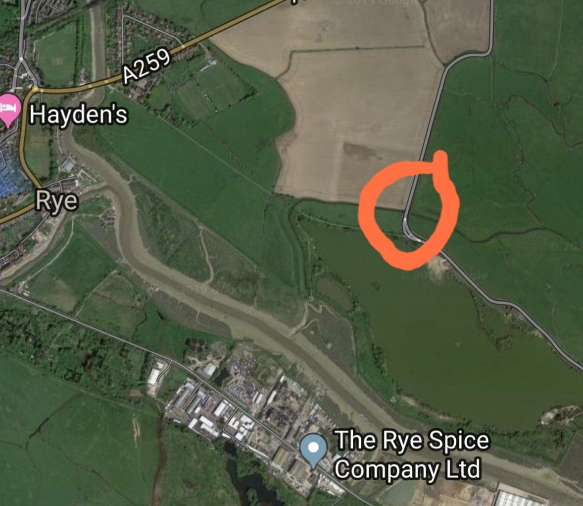 To commemorate the first world war airfield (1916-19) on farmland to the east of Rye in East Guldeford Parish, Rye and District Royal British Legion (RBL) has installed a stone memorial with a plaque provided by the Airfields of Britain Conservation Trust at the side of a lay-by on the Camber Road (see the orange circle on the map below). It overlooks the site. The airfield was used for training and to deploy home-defence aircraft to counter the German airship threat.