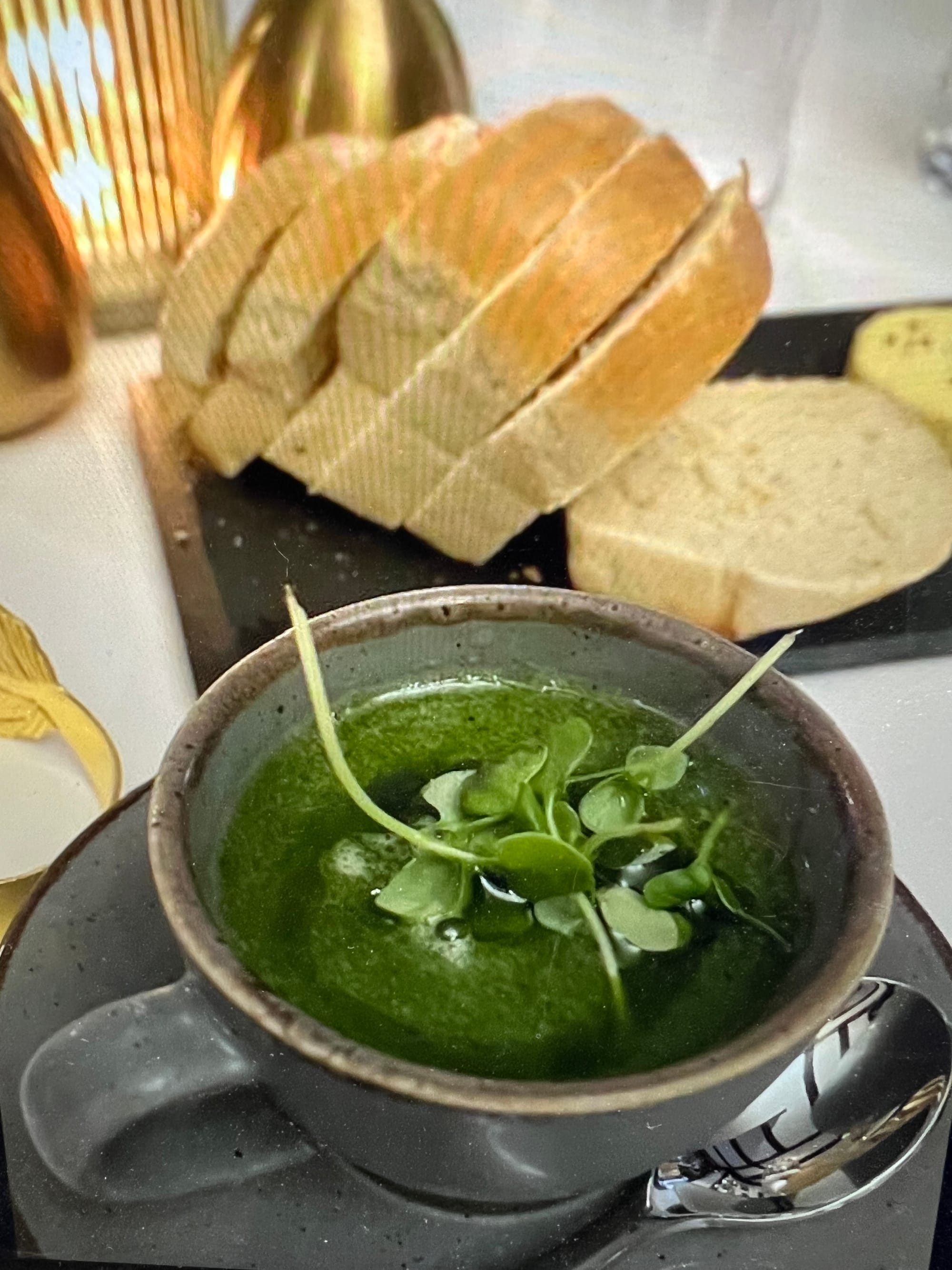 As you enter Fletchers, it feels the royal connection in history has been mirrored in the interior – lots of gold leaf, including throne-chairs upstairs in the function rooms. You can book these rooms for private gatherings. The layout is tables of twos and fours, and then through an open doorway, one table for six, and a few more tables of two and four. Tables with quality tablecloth, gold napkin holders with thick linen, and rather comfortable velvet-upholstered chairs. It’s a place which invites you in to settle, to enjoy, and to celebrate. The interior feels luxurious - thick carpet, richly upholstered furniture - creating some glamour, as well as ensuring noise is muted and conversation at your table is possible. This is in contrast to the modern trend of wood and metal in open-plan restaurants leading to noise bouncing around. Crisp white table linen and lovely large wine glasses combine to create the atmosphere that this will be a memorable meal experience.