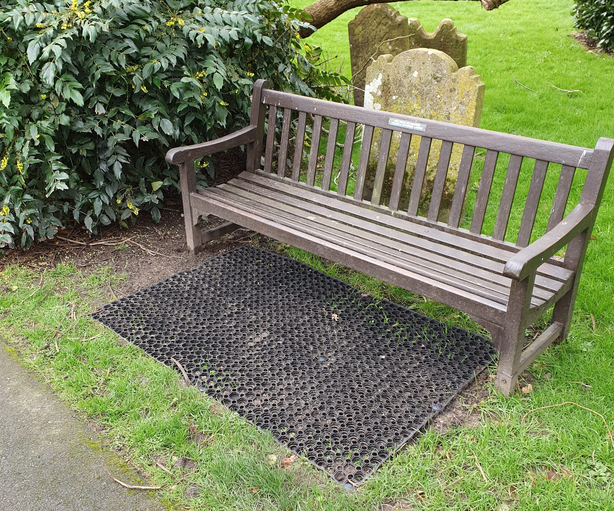 For some time we have been considering how best to improve the footwells of the 14 benches scattered around the church. These are well used by citizens and visitors alike and we have often had complaints that in wet weather, soggy ground renders them unusable. Now plastic mats have been fitted. In time the grass will grow through and the appearance will be more natural.