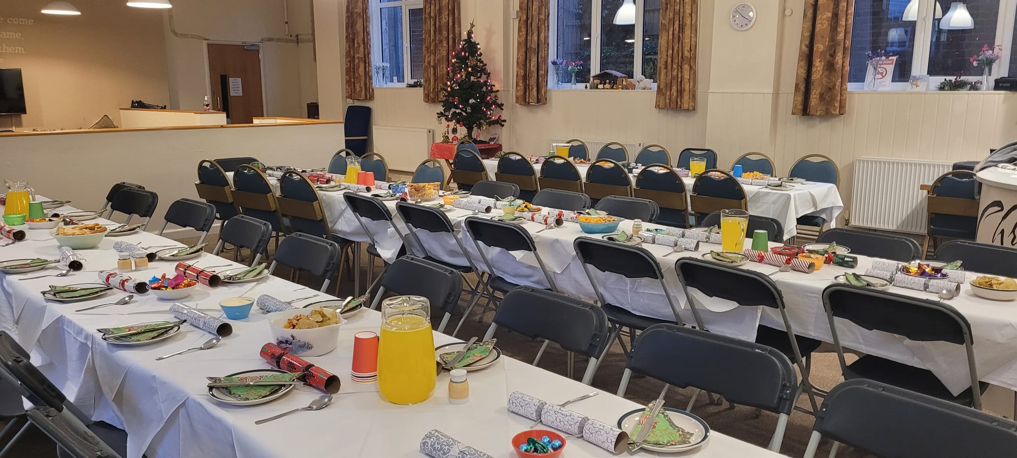 The hall at the Baptist church on Cinque Ports Street was transformed with long tables covered in white linen, laden with crisps, chocolates and sweets and Christmas crackers.