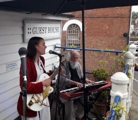 Accompanied by brilliant blues pianist Phil Law (Dr Aspalls) and performing on one of the balconies of the Old Borough Arms in the Strand, rain eventually forced the artists, their instruments and the audience to squeeze into the limited space inside.