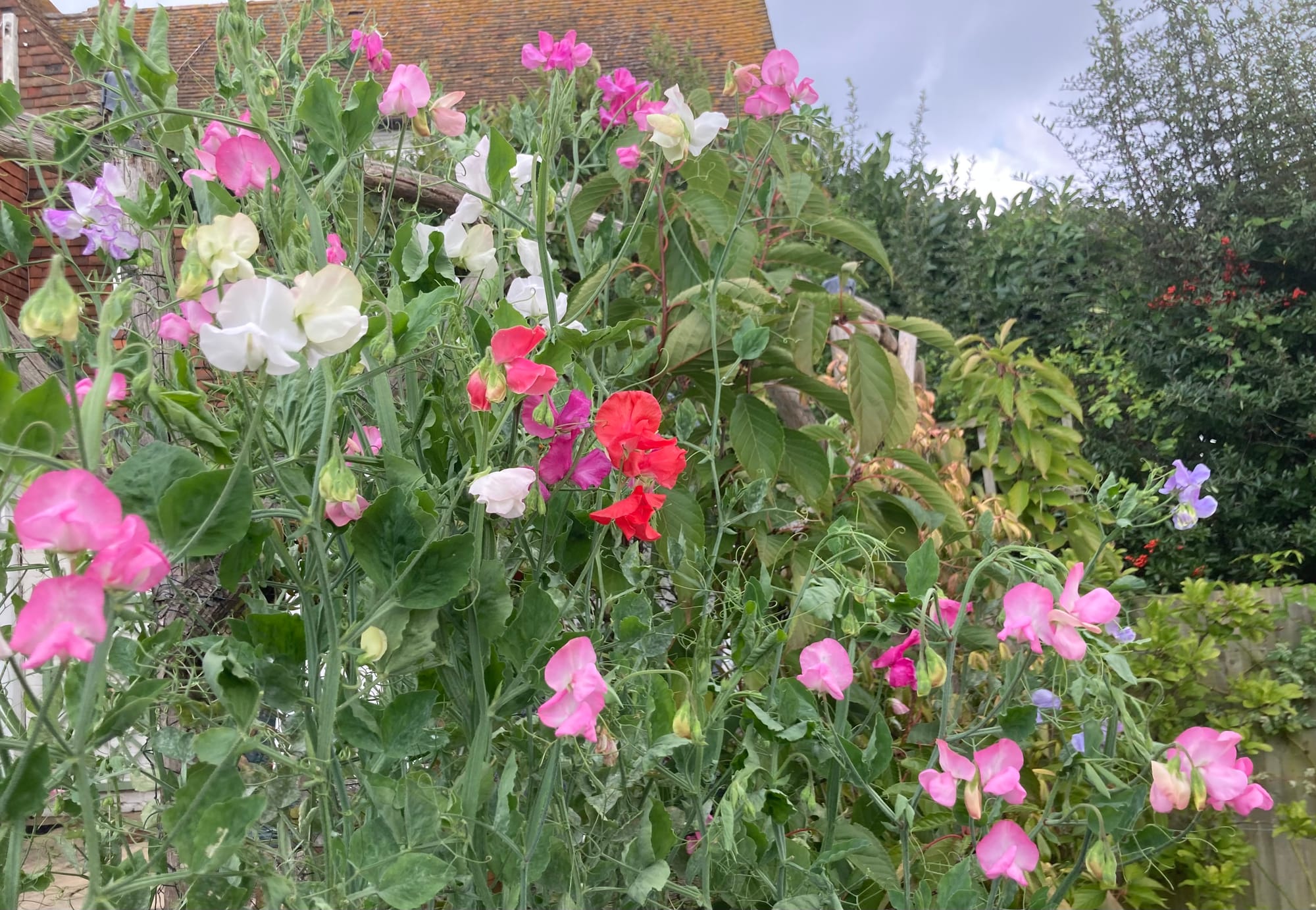 My small and precipitous garden happened to be last of the 22 this summer, and with about 50 good folk of Rye in it enjoying eating cake and drinking tea or coffee, it did look small! And just about the last flower left on the planet was a thicket of sweet peas, unpicked to give a show today.