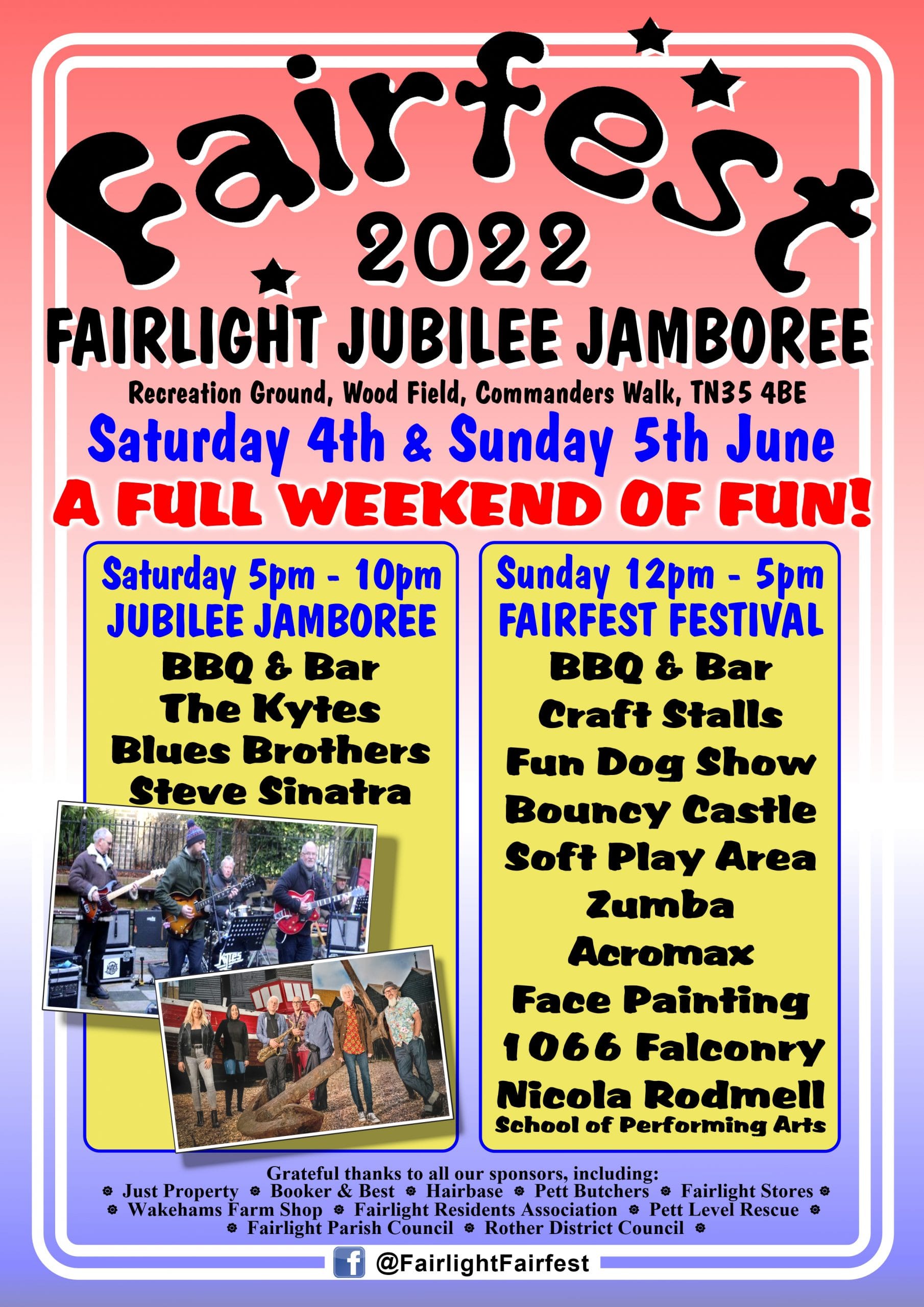 Fairlight will be celebrating the Queen's jubilee with two days of fun starting on the Saturday with a Jubilee Jamboree from 5pm to 10 pm on the Recreation Ground in Wood Field and starring the Blues Brothers, Steve Sinatra, and the Kytes.