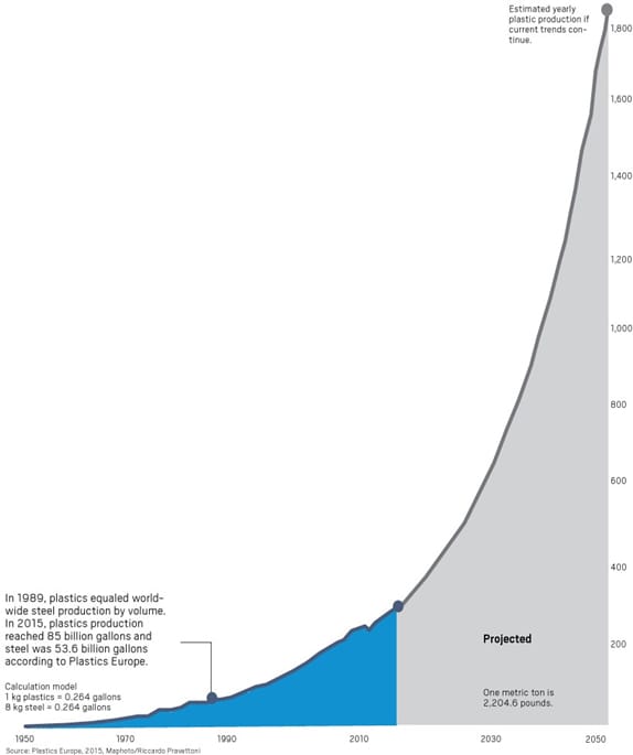 Plastic production soared from 2 million tonnes in 1950 tonnes to 400 million tonnes last year, and that figure is set to double by 2040, and triple by 2050.