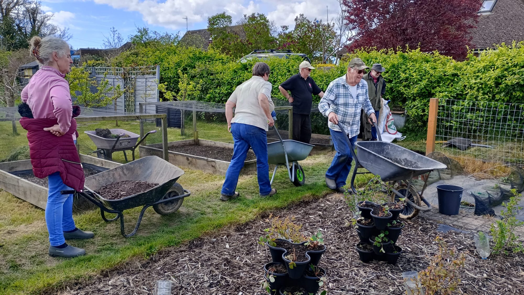 At nine o'clock on the day, Leigh Dunford, the contracted gardener, came early and helpers arrived soon after. Leigh did the heavy work removing the top soil. Then the present plot holders queued up to take the grassy earth to another plot which eventually would be picked up by the person who asked for it. This plot was not too far, others had to go with their wheelbarrows to the other end of the allotment to collect gravel earth which was delivered the previous day, bring it to the path to lay the new top level to walk on. Soon, everybody knew their position and it was like clockwork as we passed each other, getting out of the way to let people through.