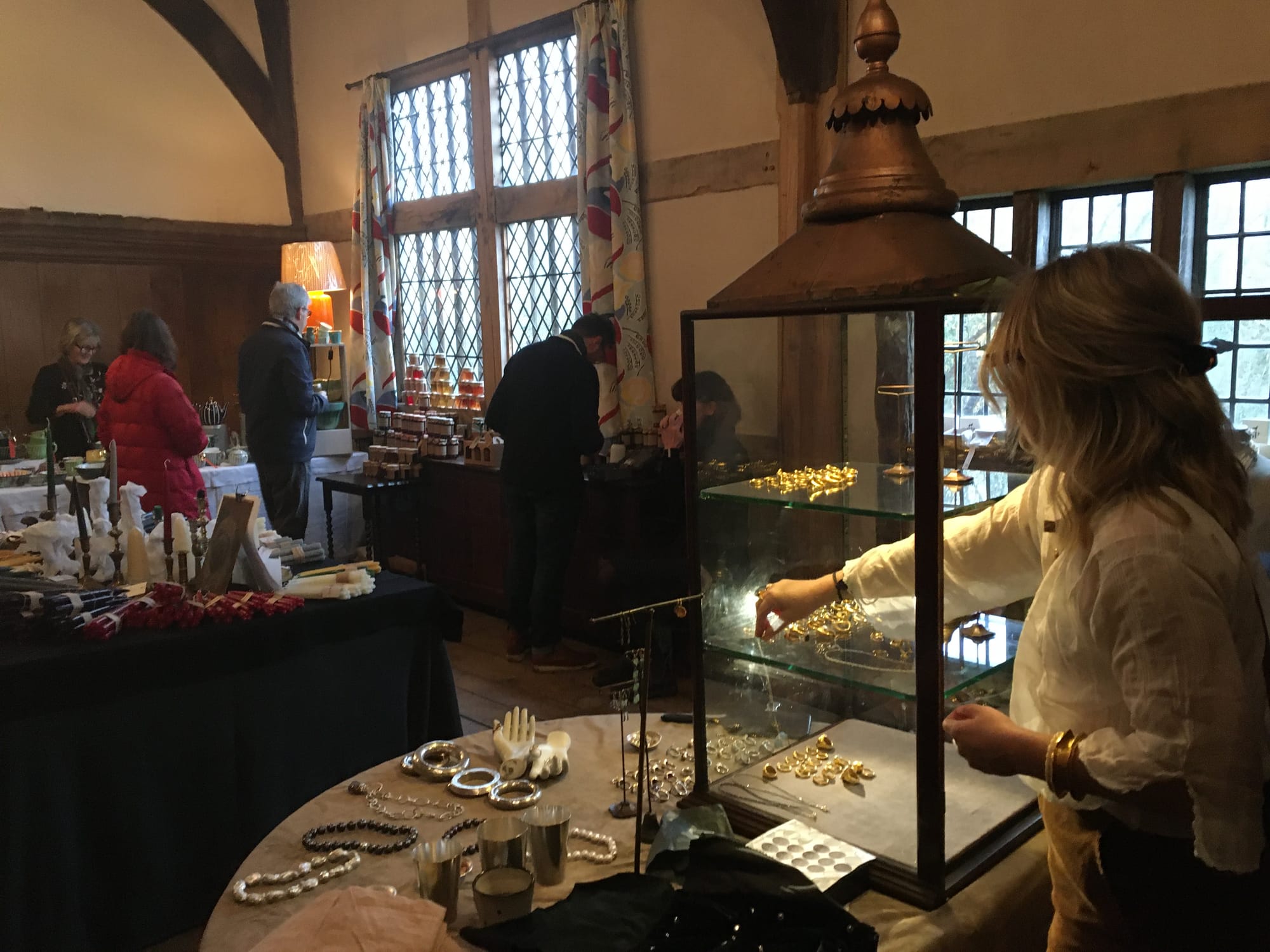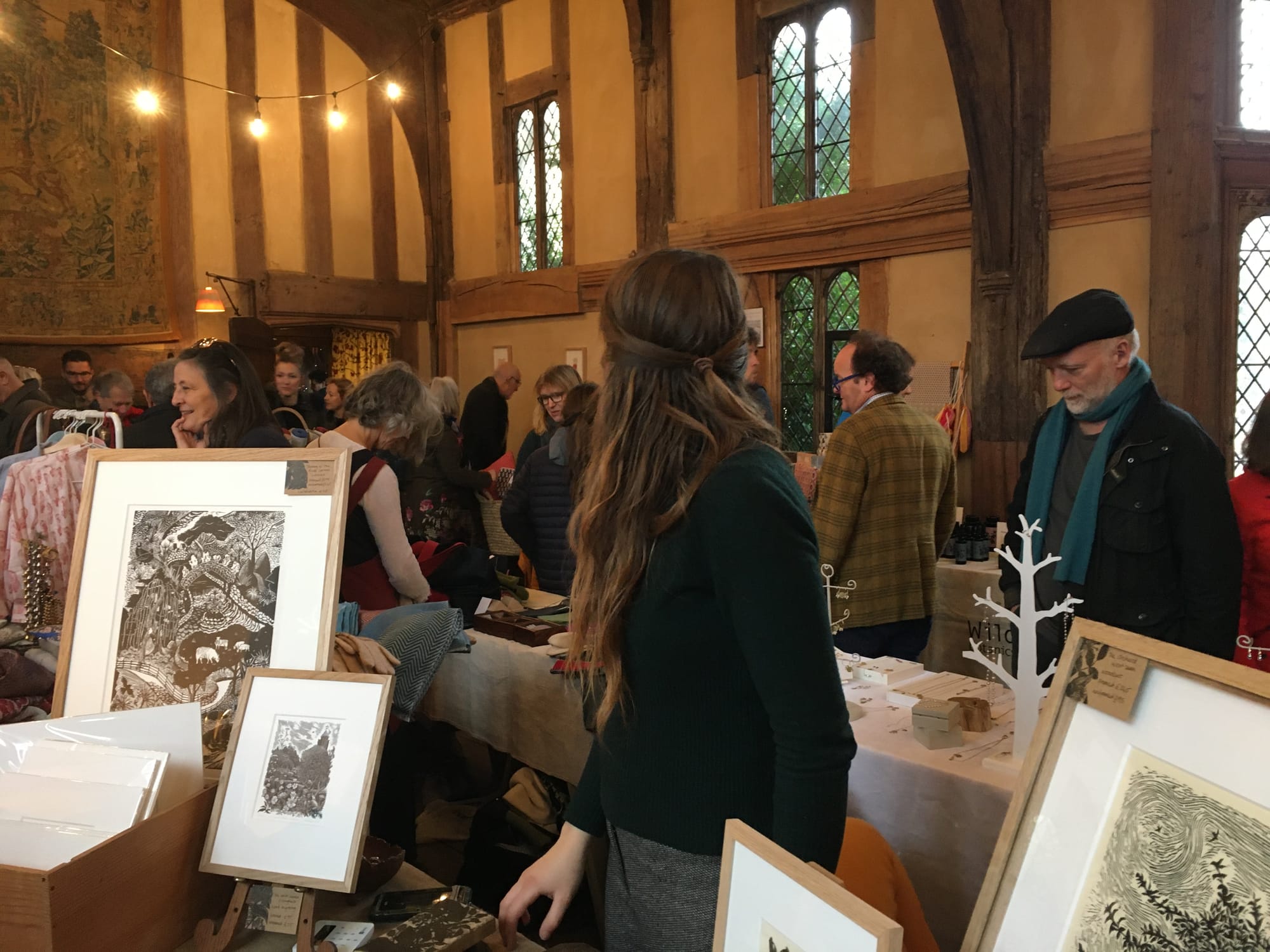 There were herbal teas and tinctures and bamboo socks, in keeping with the sustainable feel. Delicate handmade necklaces, bracelets and rings graced another stall, with cushions and printed fabrics as visitors went into the hall, which had a fire lit in the big inglenook and an enormous decorated Christmas tree reaching to the ceiling.