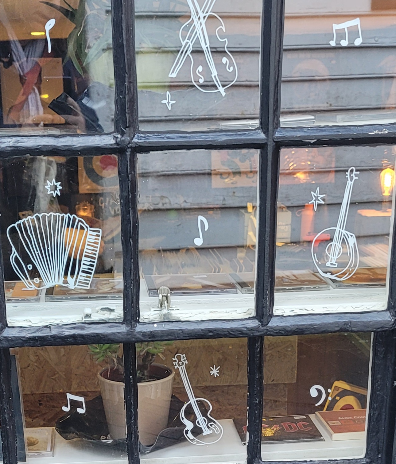 The Other Record Shop has taken the space vacated by Sailors, now located in the High Street, and is crammed with second-hand and new vinyl, CDs, books, cassettes and posters, displayed in handmade wooden stacks and spilling out into the passageway outside. Potential customers are guided to the shop by an LP-shaped sign on the Mint as well as an occasional A-frame sign on Cinque Ports Street. The windows are painted with musical motifs designed by Evie Adams and the bold shop sign, designed by Nancy Nicholson, is reminiscent of record labels and design of the 50s and 60s.