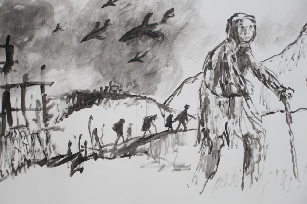 The subject matter seems drawn from a world, much like our own, pushed to the cliff-edge of its own existence: displaced figures rove across empty landscapes blasted by war, or ecological crisis; sinister planes and drones haunt the skies above; and the implacable stares of dozens of anxious and havoc-struck faces are the focus of an array of portrait studies of assorted refugees, apprehensive women, orphans, ‘unfortunates’, and some grotesques Blake has called ‘eroded heads’.