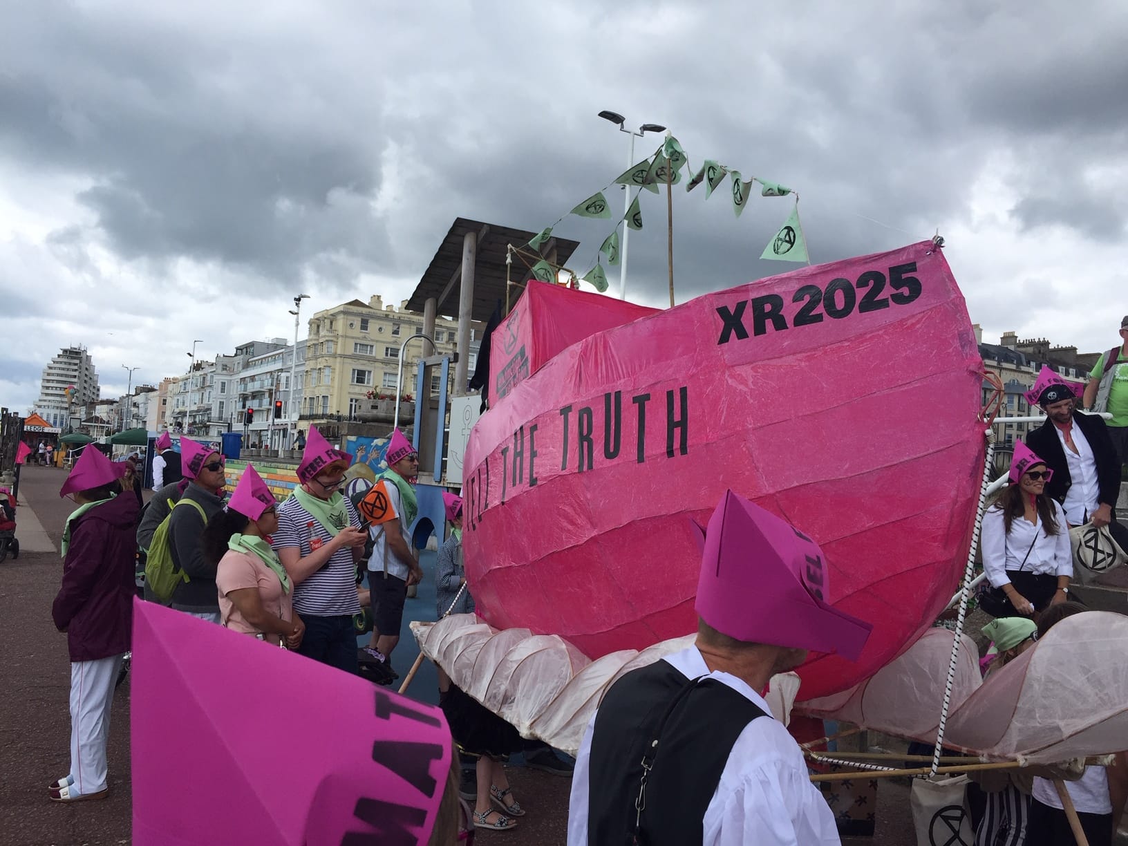 There was a focus on the environment, with information stalls including Clean Seas Please and Plastic Free Hastings. Extinction Rebellion Hastings joined in, carrying their new pink boat along the seafront and handing out “Black Spots” which explained the reasons for the climate emergency.