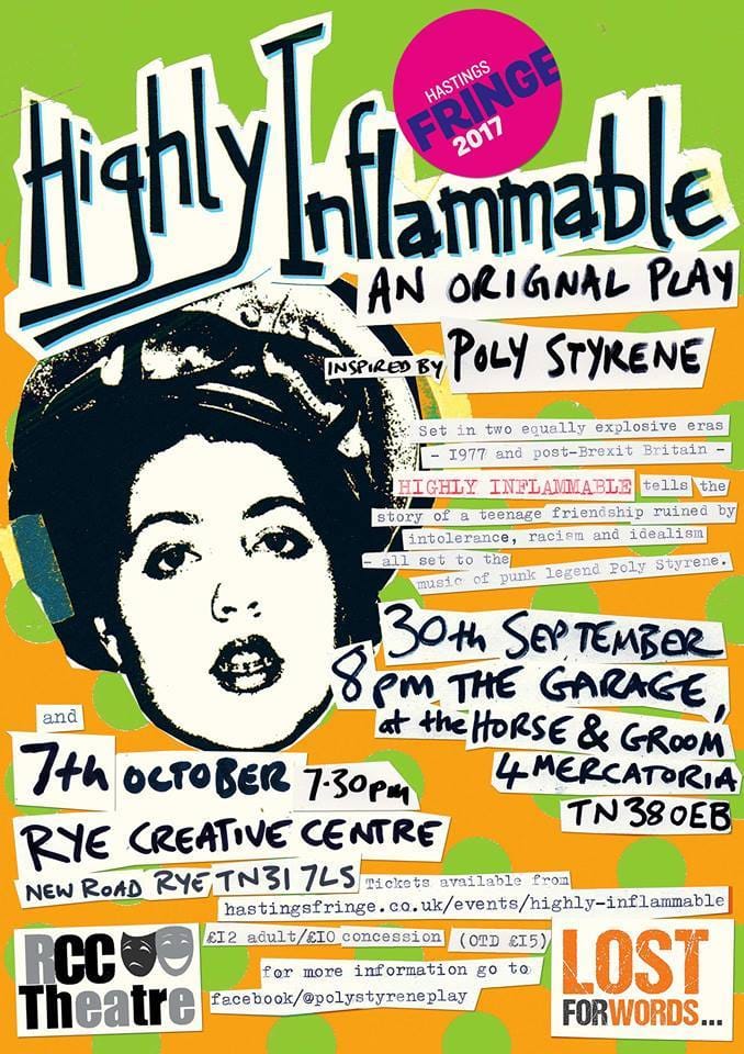 Set in two equally explosive eras – 1977 and post-Brexit Britain – Highly Inflammabletells the story of a teenage friendship ruined by intolerance, racism and idealism, all set to the music of punk legend Poly Styrene. Local resident Poly Styrene formed the inimitable punk band X-Ray Spex after seeing a gig by the Sex Pistols on Hastings pier in 1976. Crackling with music, energy and plenty of punk outrage at the state of our nation, Highly Inflammable asks what we could have done then to make the world different now.