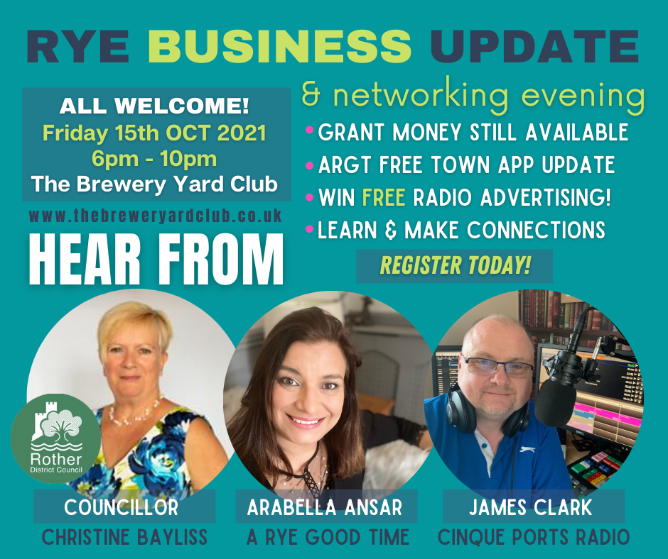 If you go down to the Brewery Yard Club on Friday, October 15 from 6pm onwards you're sure of a big surprise! It's a free networking opportunity, and all are welcome to attend the newly formed Rye Business Update which hopes to be a regular event, in association with the Rye Chamber of Commerce, aimed at helping local businesses affected by the Covid pandemic.