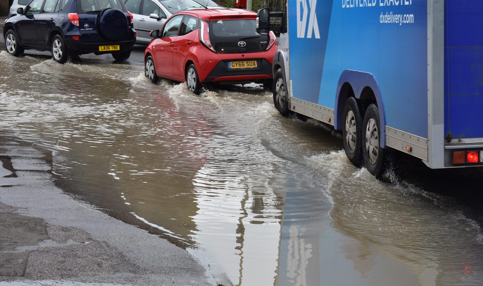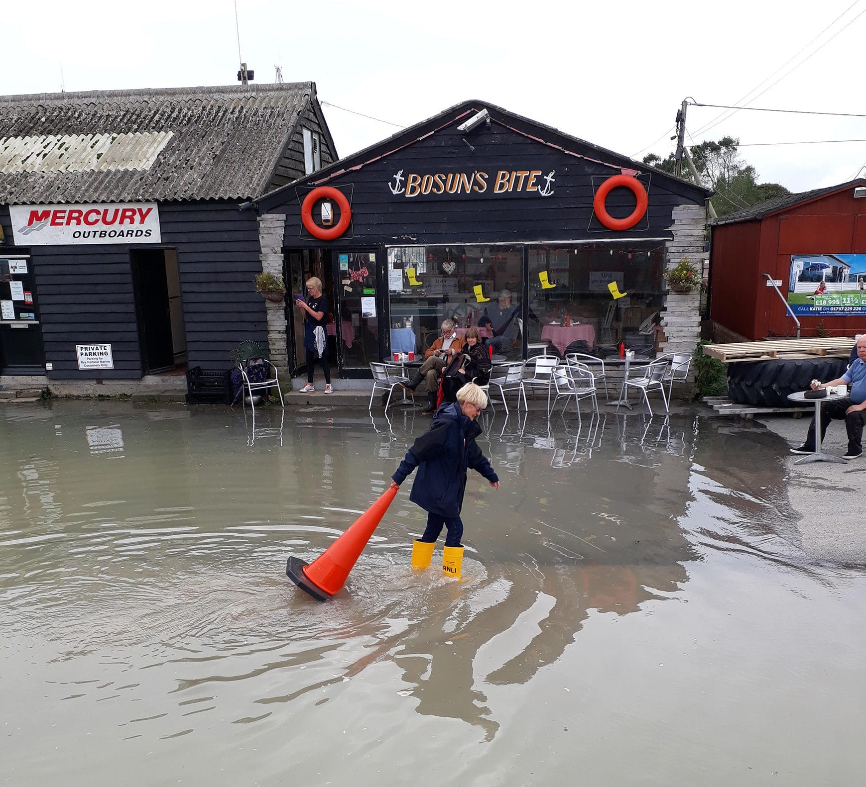 However visitors to the Bosun's Bite (shown right) clearly took King Canute's attitude to rising waters and carried on supping their beverages while RNLI publicity officer KT Bruce took emergency action.And, back in Rye, motorists did their best to cope with the usual flooding in Winchelsea Road.