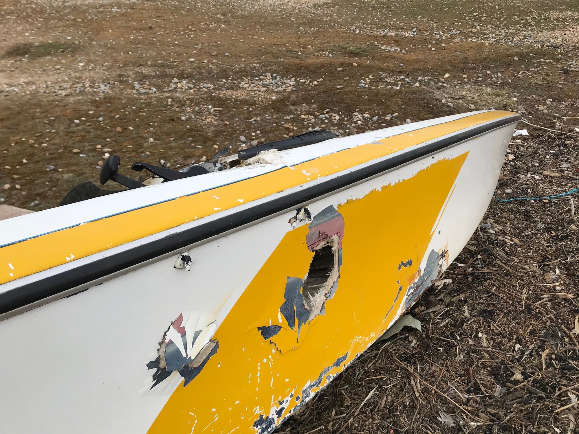 Who does the seemingly abandoned boat belong to ? was it damaged, then washed up on the beach? Did it get damaged where it sits now? What is its history? How did the hole appear, by accident or design?