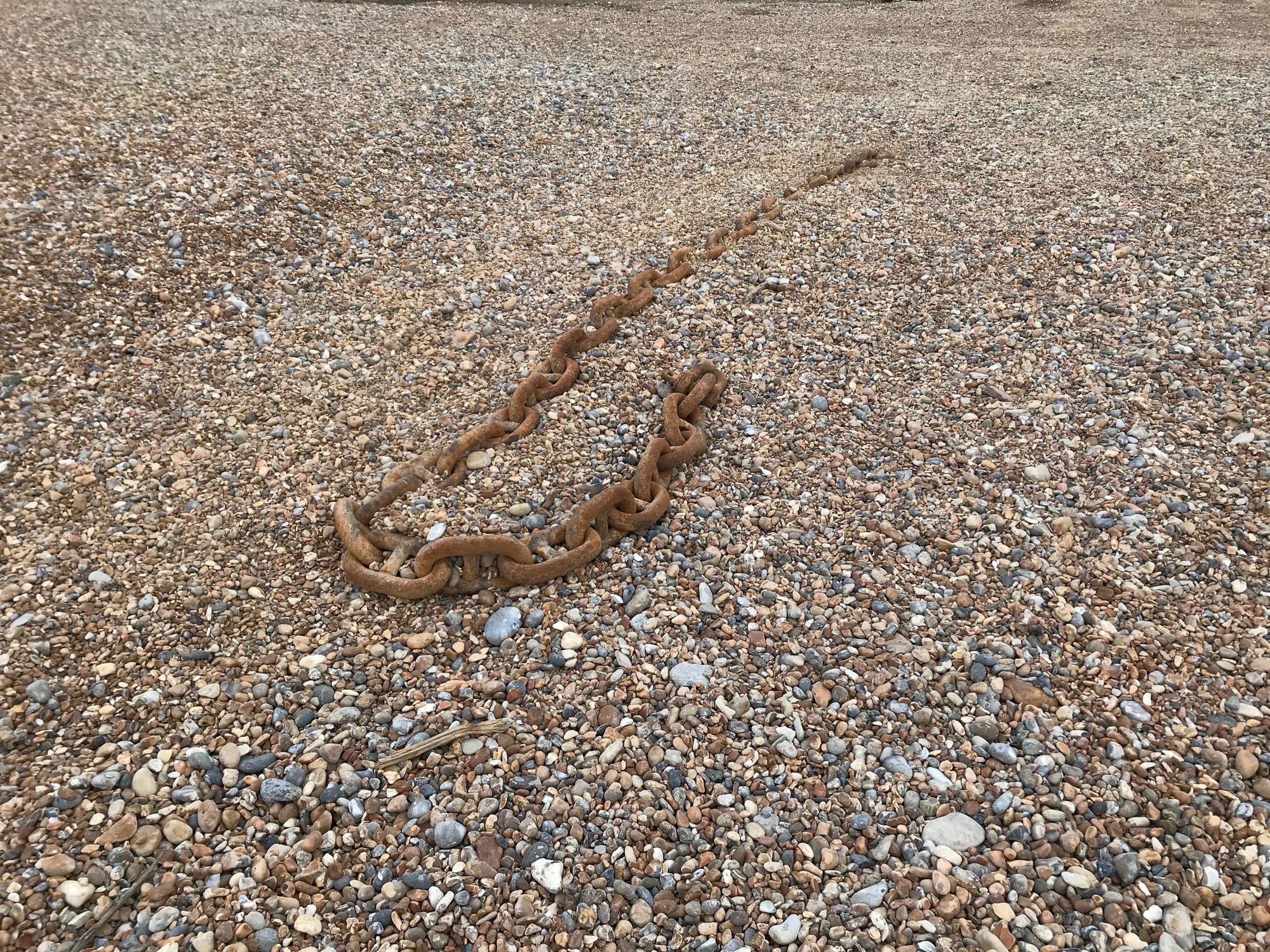 Carrying on to the shingles, the big machines, at least for the moment have gone, and huge mounds of re-positioned pebbles remain, but in among all the mounds was a huge chain of industrial sized rusting links and a boat which looks as if it has been washed up there.