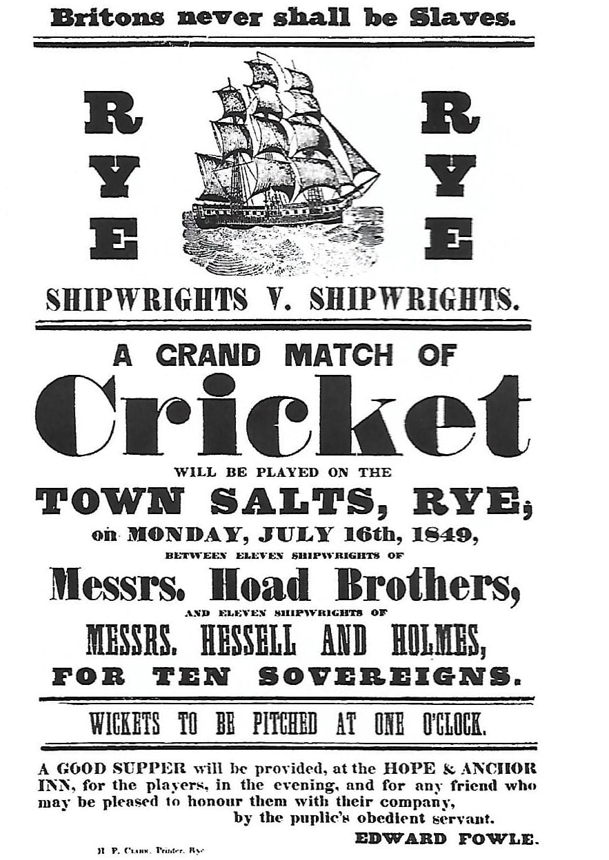 I have always wondered if the "&" had been dropped deliberately and in the recent Rye News article on ship building in Rye there is a notification advertising a cricket match to be played on Monday, July 16 1849 on Rye Salts.