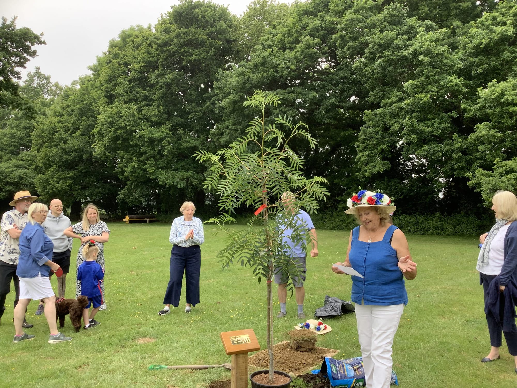 We started with a service in a packed All Saints Church, beautifully decorated with displays by village groups. Next was the tree planting: Iden WI had gifted a rowan tree to the parish and this was planted by Lynda Wood, President of Iden WI, near to the walnut tree which was planted to celebrate the Diamond Jubilee.