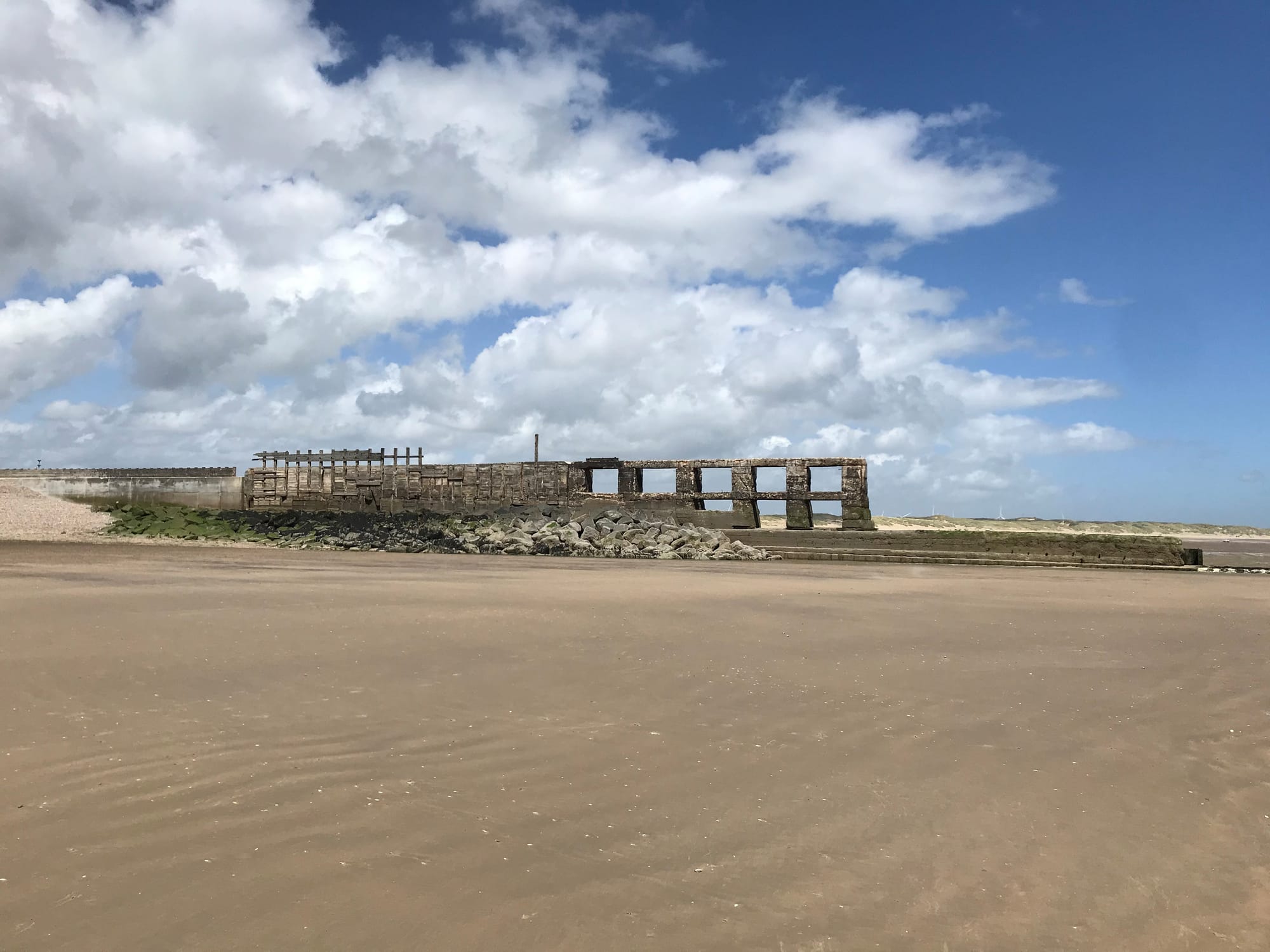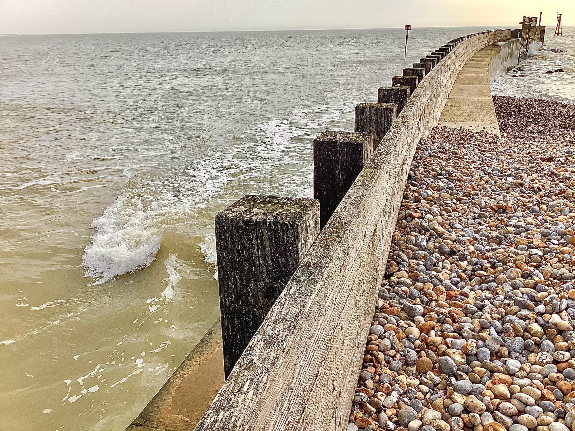 Concrete features quite prominently as you reach the sea edge as the sea defences stretch out into the water and its square sections give the appearance of windows as you look through them and along the coastline.