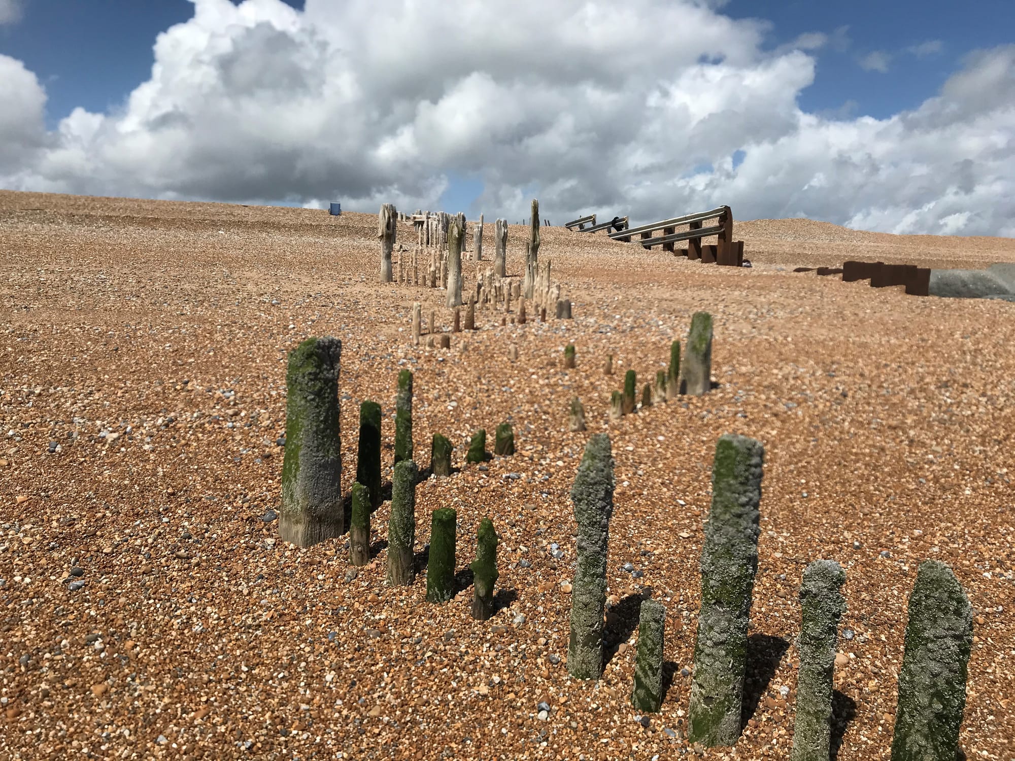 The timber groynes are a stark contrast as they zig zag through the shingles, long standing residents which have stood the test of time.